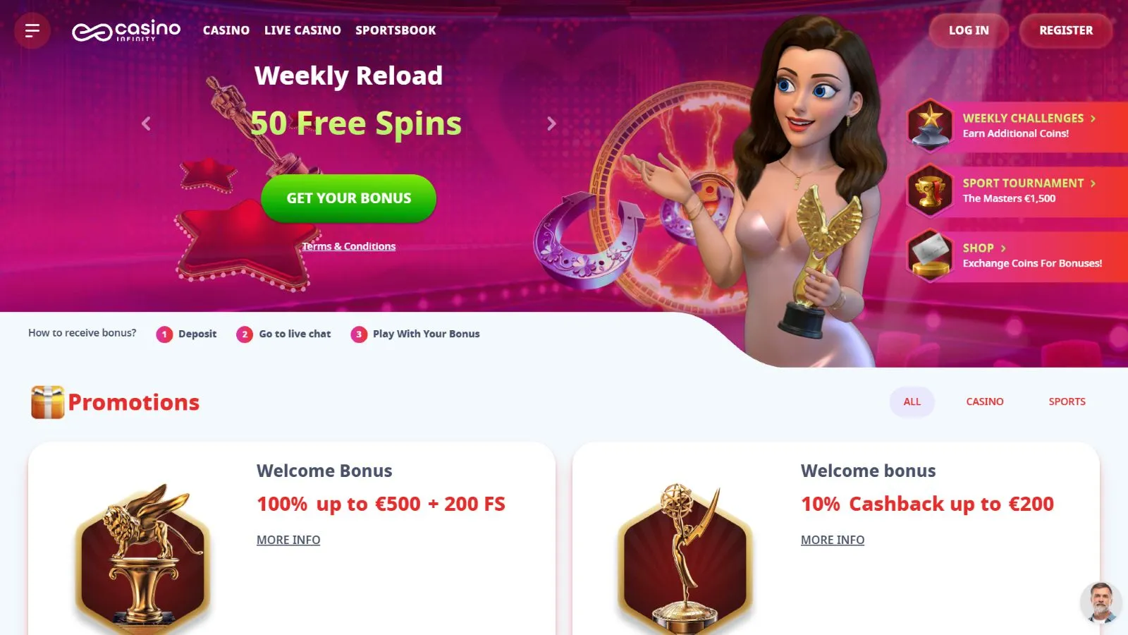 For those who love sports betting, Casino Infinity offers a 10% cashback. Make a deposit any week, and if luck isn’t on your side, get a cashback ranging from €20 to €500. The cashback needs to be wagered 3 times and can be activated by reaching out to the support via Live Chat or email.