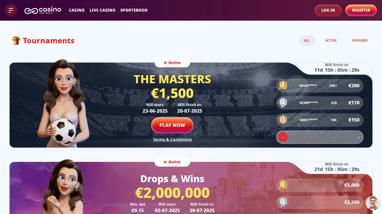 For the competitive spirit in you, Casino Infinity is loaded with tournaments. To get to them, click the “Tournaments” button in the top menu, Here, you’ll not only see casino competitions but also sports ones like “The Masters”. Also, keep in mind that some tournaments offer cold hard cash, while others grant you Loyalty Points which can be later used in the Casino Shop.