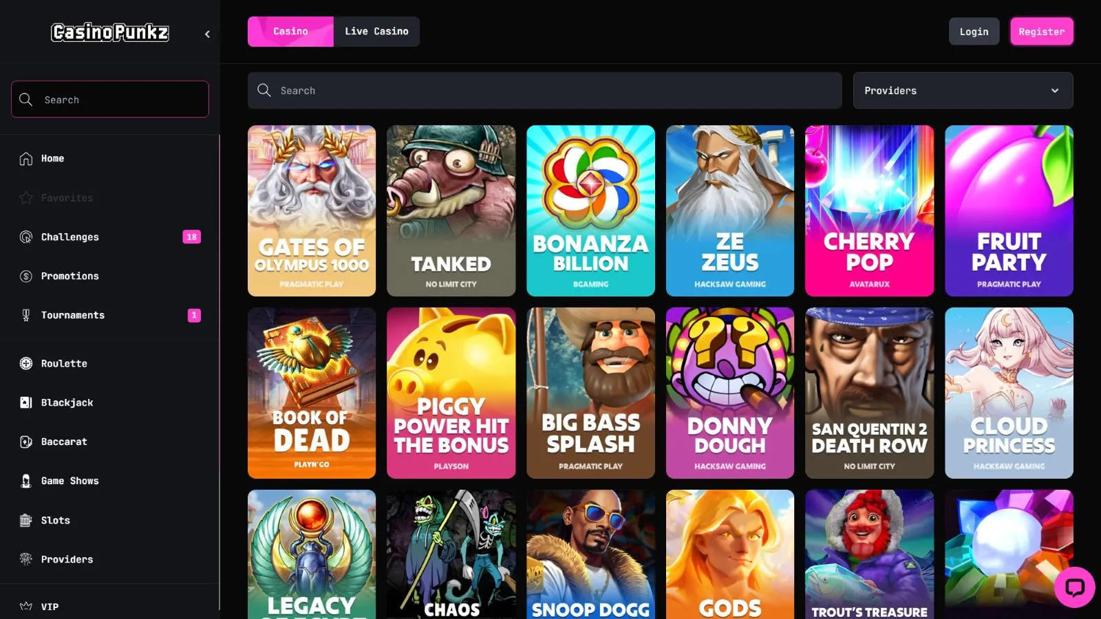 At Casino Punkz, there’s an exciting world of high-quality games that keeps you entertained all day. The lobby is powered by 55+ game studios, including top companies like: