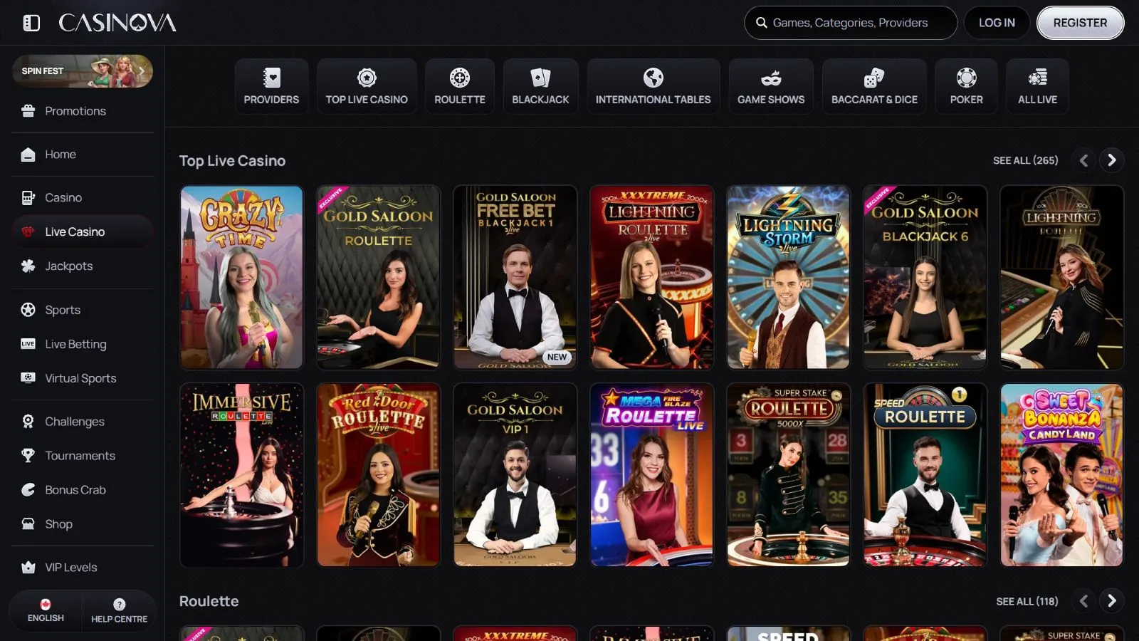 Slots lovers on the platform have 9,000+ slot games to enjoy. There are classic fruit machines, 5-reel video slots, megaways, progressive jackpots, and all kinds of games with spinning reels. Casinova features the most popular slots in the world and regularly updates its collection with fresh titles.