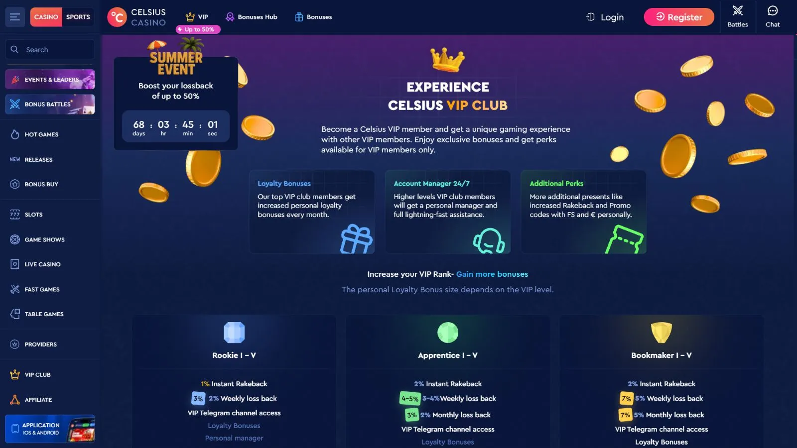 The casino battles are an excellent way to compete and the many tournaments that are being hosted. Finally, the VIP program at Celsius online casino will give you up to 22% Instant Cashback, plus access to their daily, weekly, and monthly bonuses.