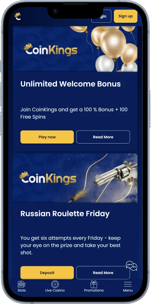 Whether you use an Android phone or an iPhone, you can enjoy playing at CoinKings with ease. The casino site adjusts smoothly to smartphones and tablets, regardless of the screen size.