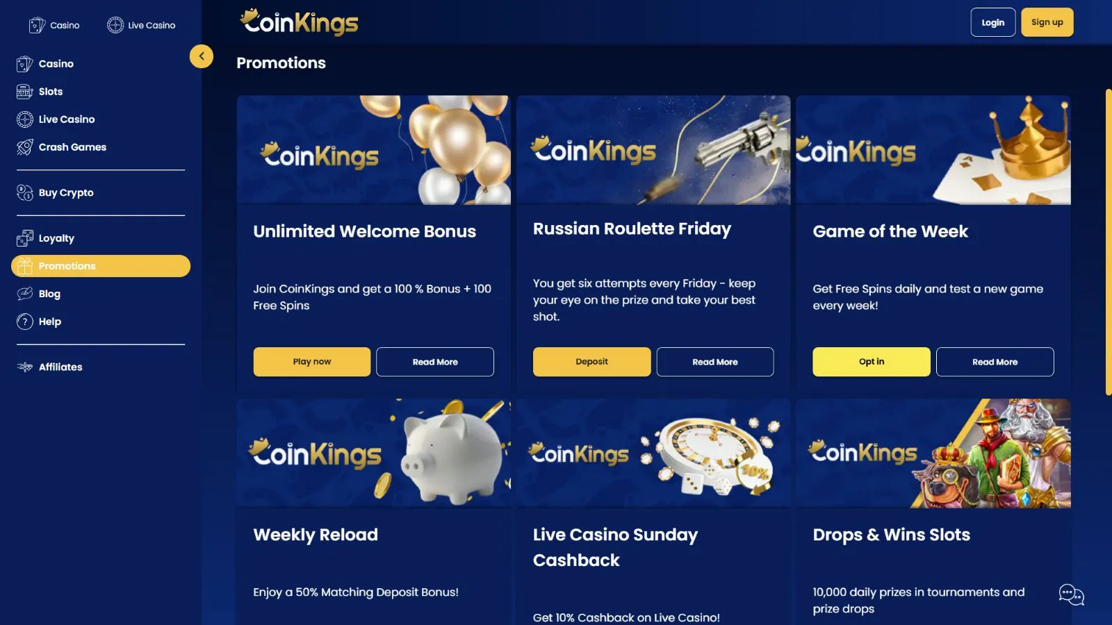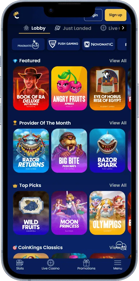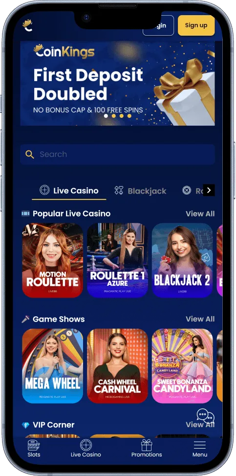 Prepare your mind for a limitless gambling experience at CoinKings, with a library of over 8,000 casino games. This iGaming site provides you with a fine mix of slots, table games, live casinos, crash games, and many other categories.