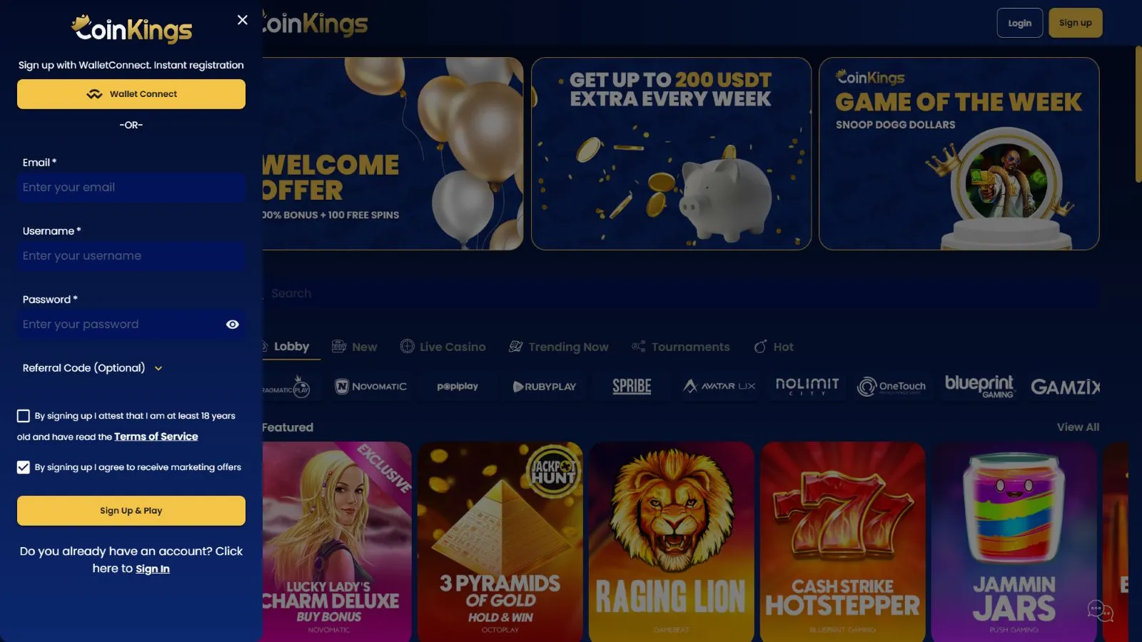 Established in 2024, CoinKings Casino is an online crypto gambling site known for its top-notch games, unlimited welcome bonus, and fast payouts. The crypto casino offers its services in English, French, Spanish, and 5 other languages.