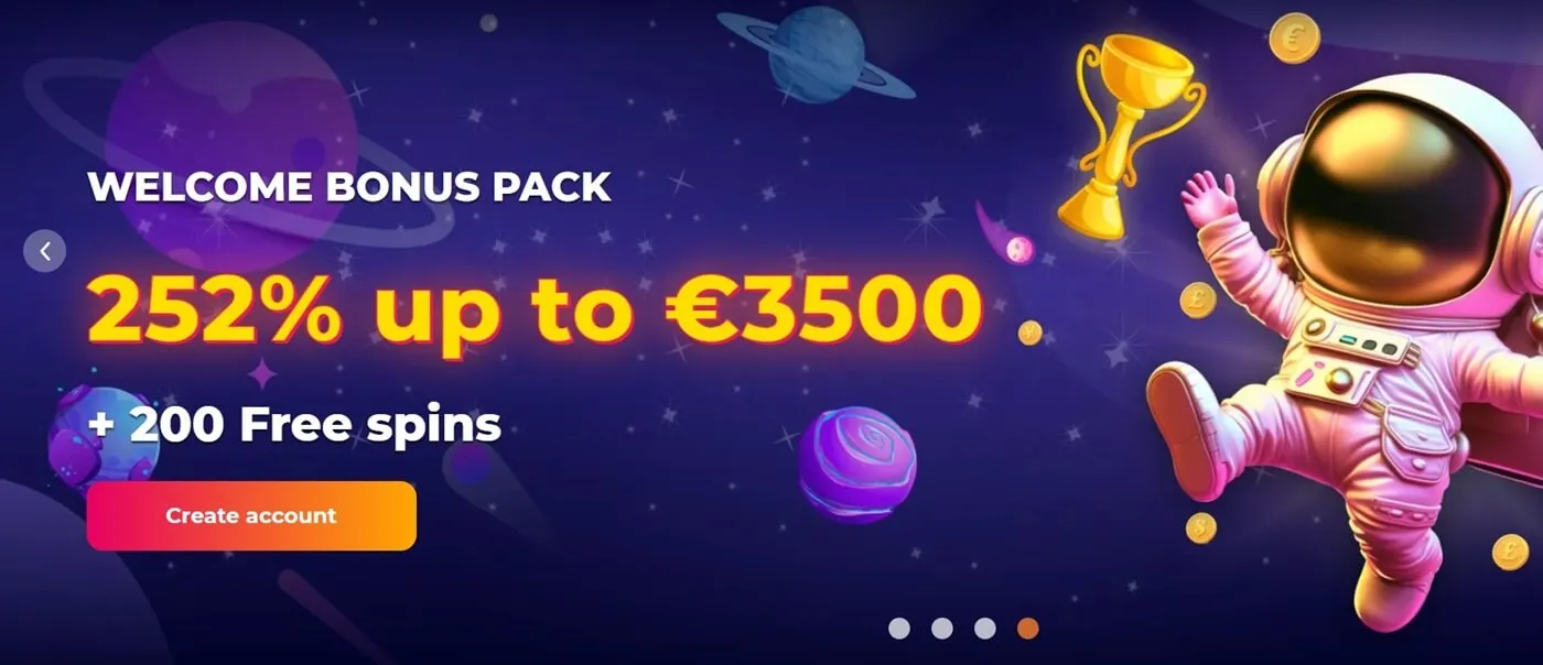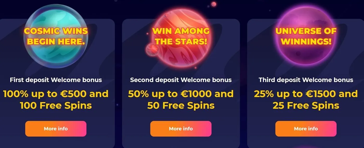 CosmicSlotCasino decided to offer their players Three Welcome Bonuses for their first three deposits respectively. The total value of the welcome bonuses equals €1,000 + 200 free spins!