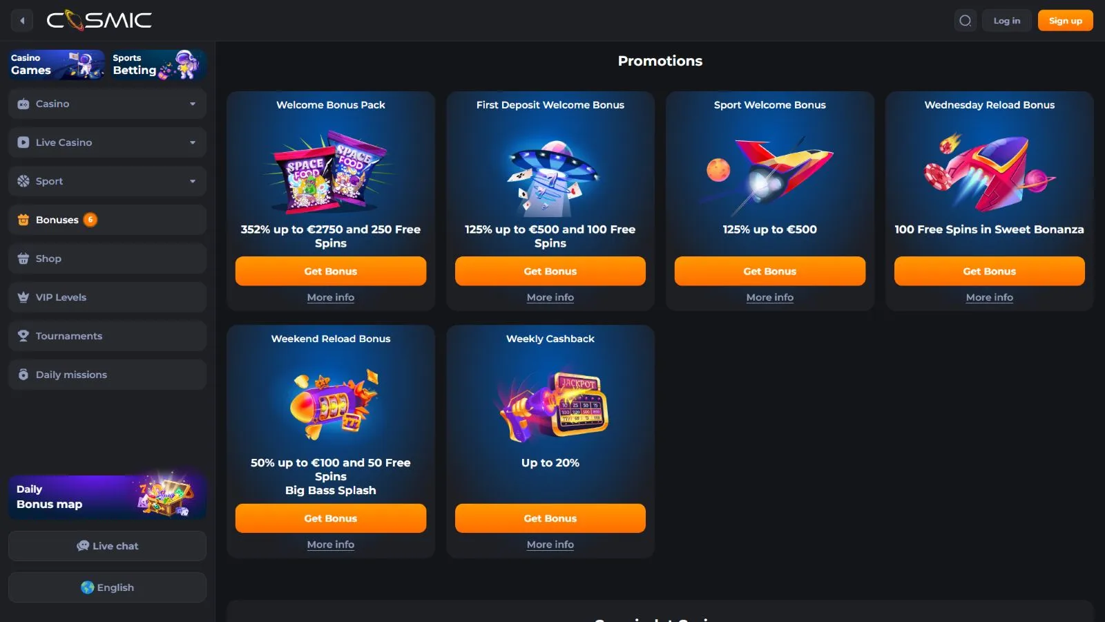 At Cosmicslot casino you will be treated with several bonuses. They come as free spins, welcome bonuses, reload bonuses, weekend bonuses, and a special VIP program. Continue reading and you will get to know the details about each one of the amazing bonuses that this fresh casino has to offer.