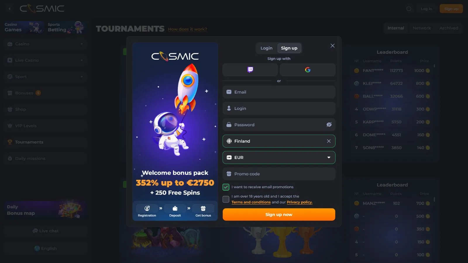 As you play any games at Cosmic Slot casino, you will generate Loyalty Points. The more you play, the more points you will get. To exchange your Loyalty Points, head to the Shop section and choose between “Free Spins” or “Bonus Money” exchange. Just pick your desired reward and swap the points you have for it. At the moment, you can swap 100 Loyalty Points for a €25 bonus amount, which is the highest bonus available.