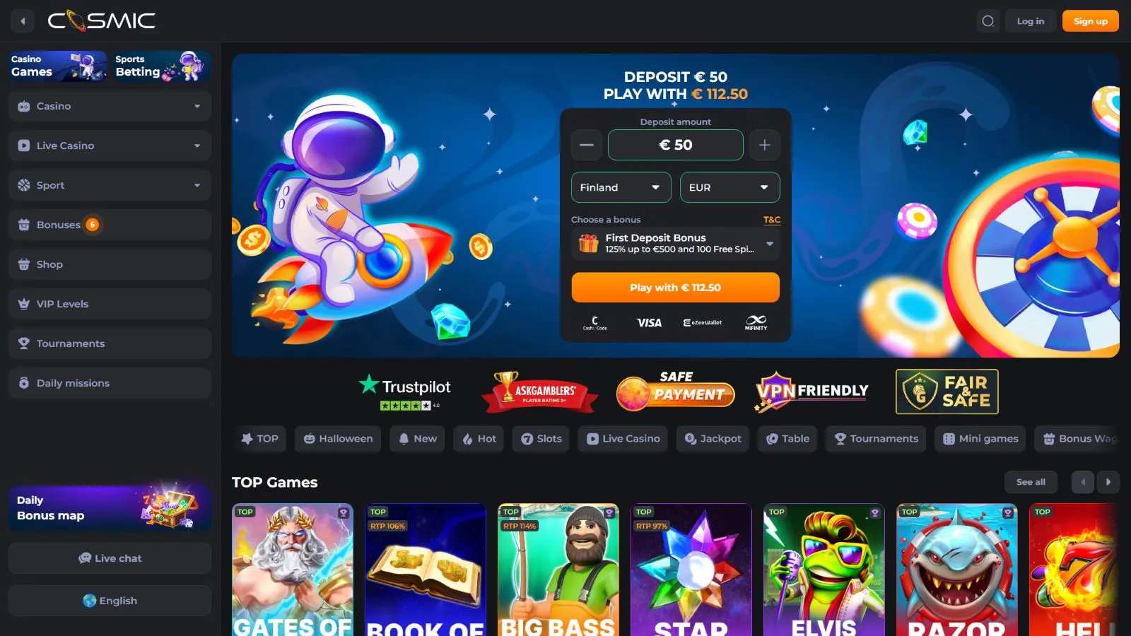 Cosmicslot casino has a full range of online casino games. There are thousands of different slots, jackpot slots, and live casino games. You can choose between providers as Yggdrasil, Pragmatic Play, NetEnt, Quickspin, Red Tiger, Evolution, and many others.