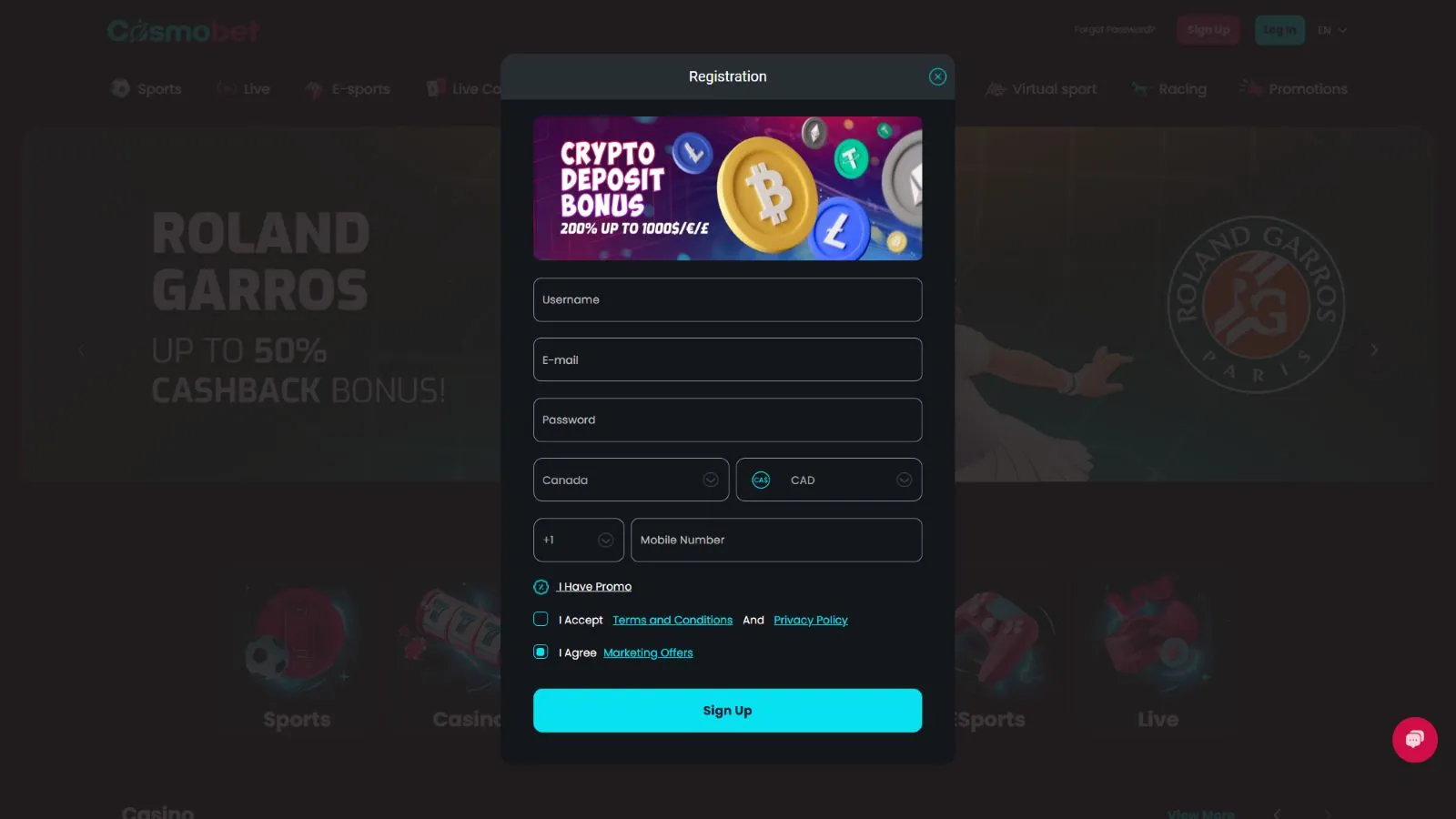 Like most gambling sites, you must register an account before you can start to bet and win real money at Cosmo Bet. These are the steps to sign up at Cosmobet: