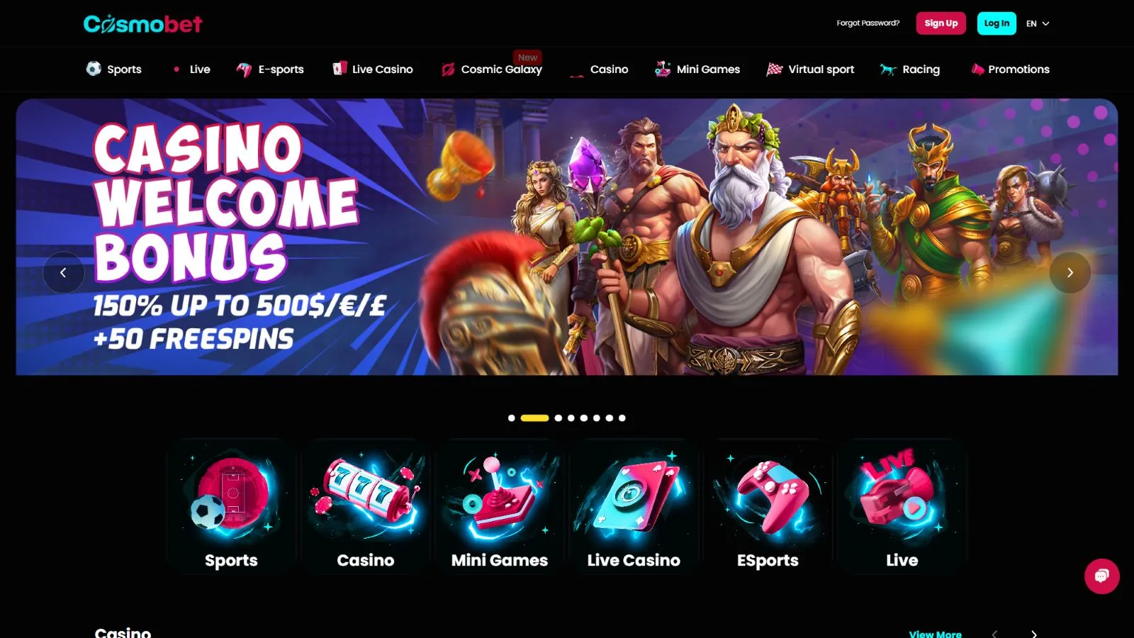 Welcome to our detailed Cosmobet review. Established in 2023, Cosmobet is a solid cryptocurrency gambling site that offers casino gaming, sports betting, and even esports. The iGaming site boasts a sleek, user-friendly interface available in 10 languages, ensuring accessibility for players worldwide.