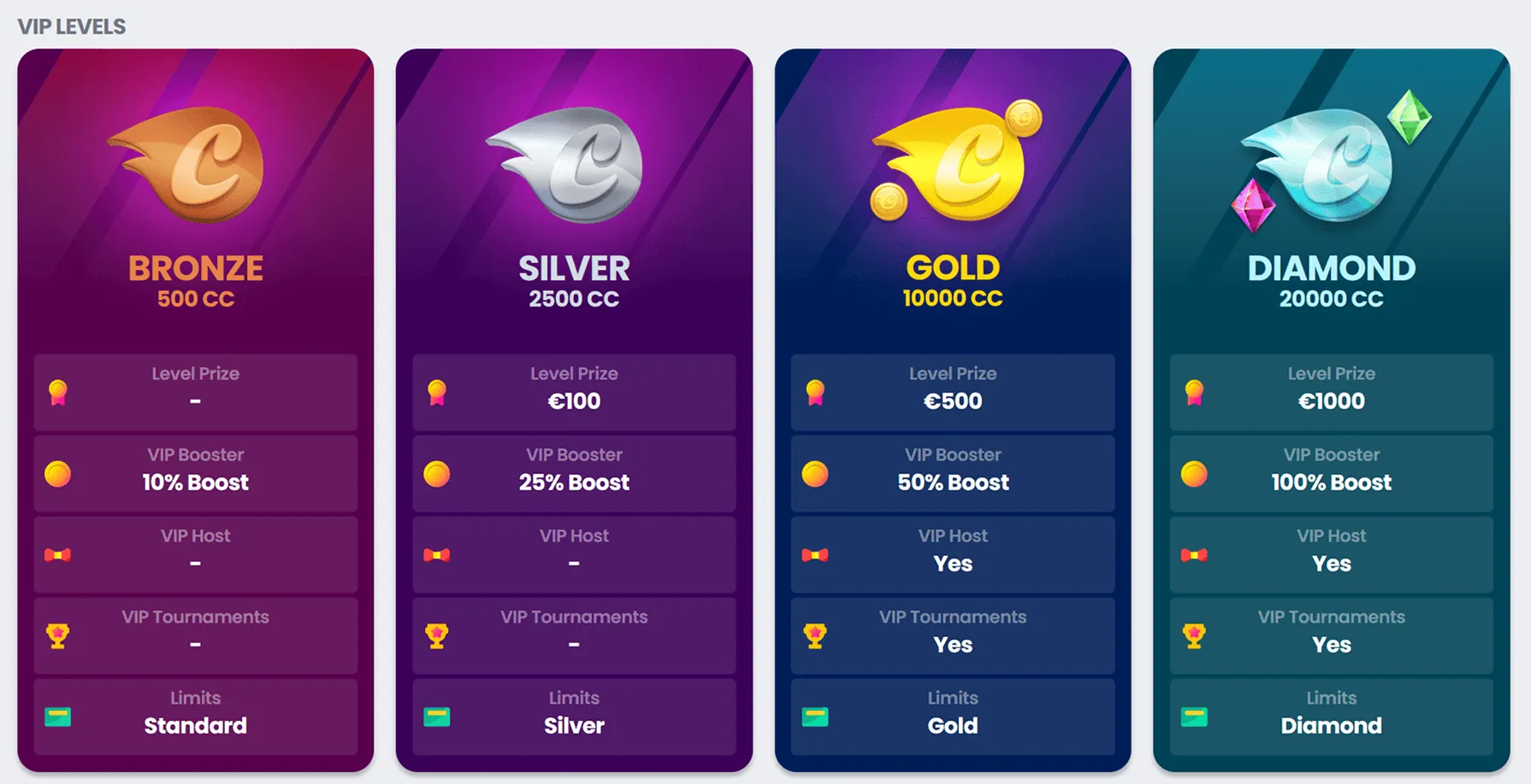 | Diamond | 20,000 | €1,000 | 100% | 50% | €5,000 | 3x | VIP Host, VIP tournaments |
