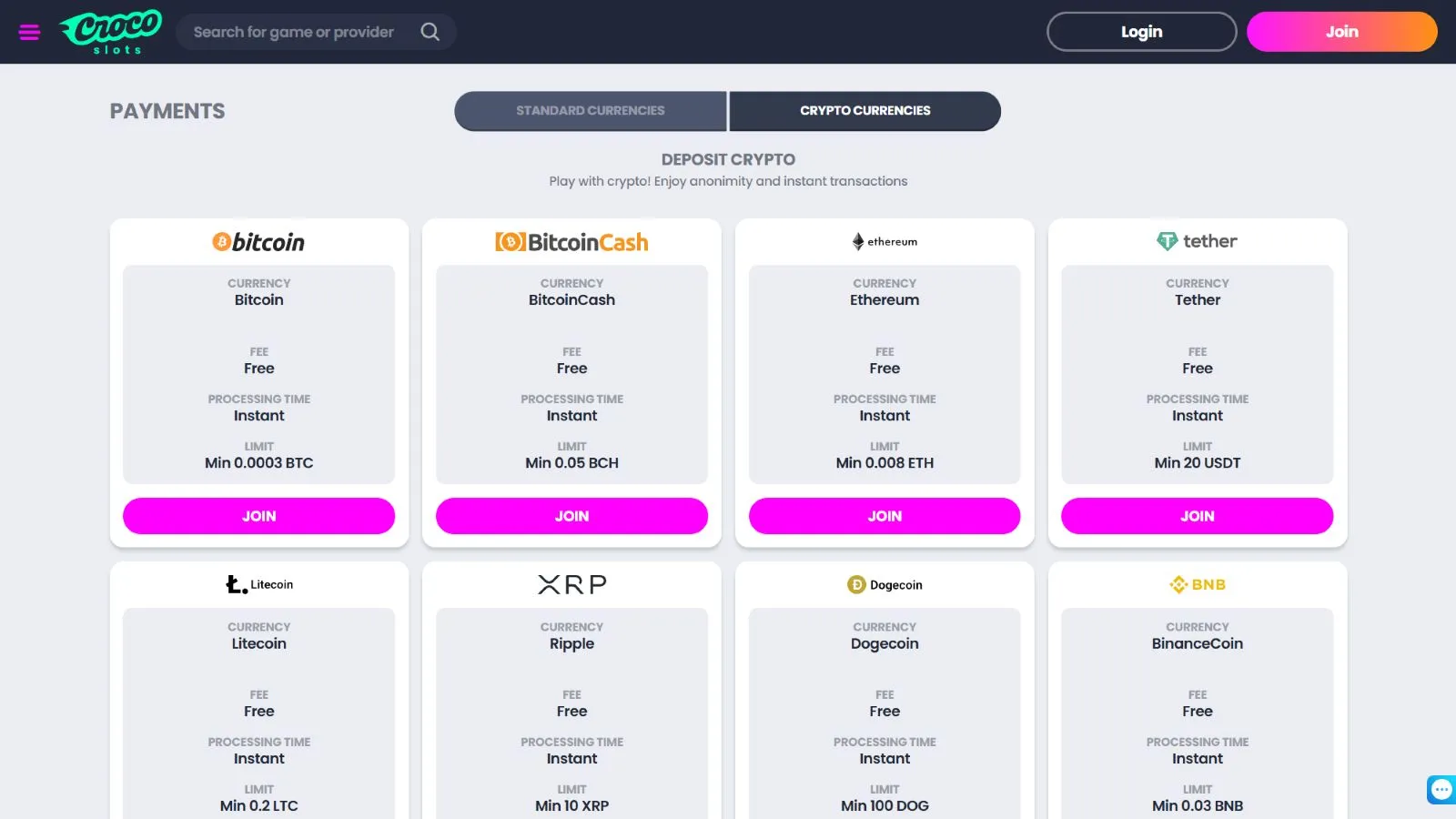 The banking system at Crocoslots features both fiat and cryptocurrency options. During registration, you will have to select your account currency from 10+ fiat currencies and 10+ cryptocurrencies. The fiat options include EUR, CAD, USD, AUD, and INR, while the cryptocurrencies include BTC, BNB, ETH, and DOGE.
