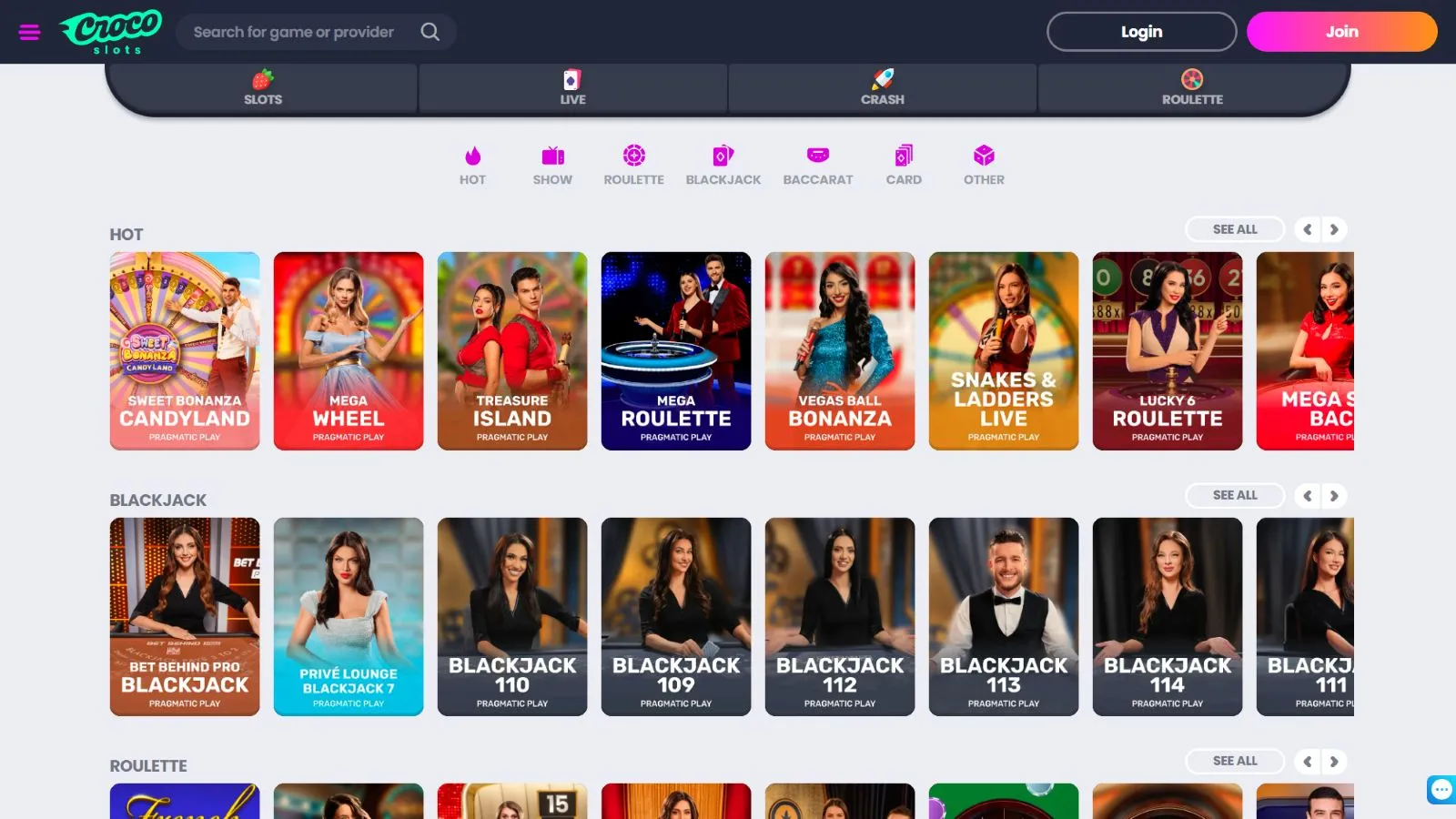 Crocoslots Live Casino is packed with 500+ awesome games, making sure the fun never stops. These include 200+ blackjack, 200+ roulette, and 40+ baccarat live games.