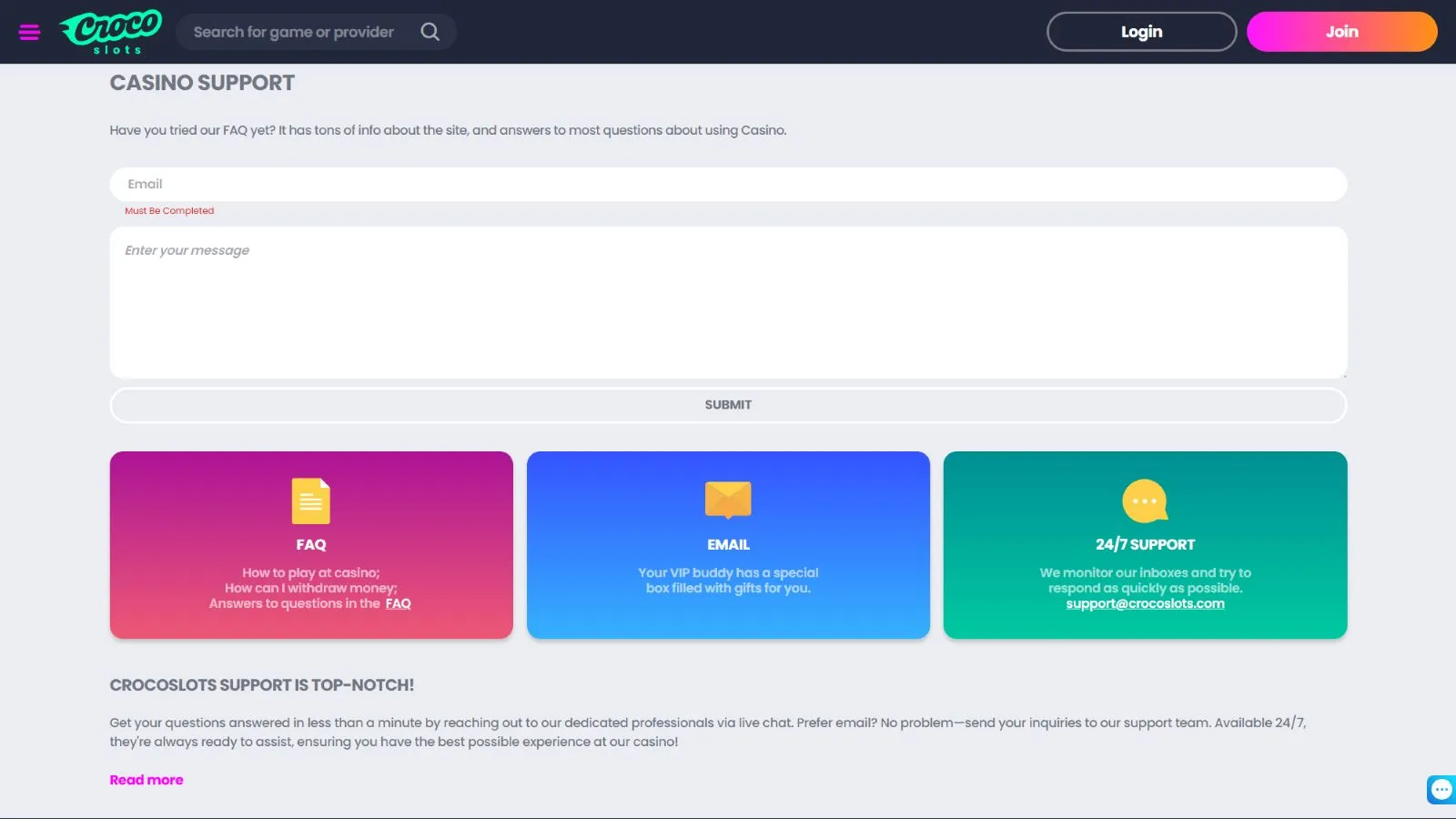 The Croco Slots team prioritizes your satisfaction and thus offers a dedicated customer service system. It has a detailed FAQ page, which answers many important questions. Whether account creation, bonuses, or deposits, the FAQ covers them.