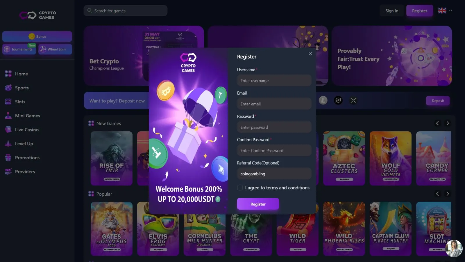 It is very simple to create an account at Crypto-Games.io casino. Click on “Join Now”, fill out the form and click on “Register”. Then you will have an active casino account, and you can make your first deposit and grab up to 20,000 USDT.