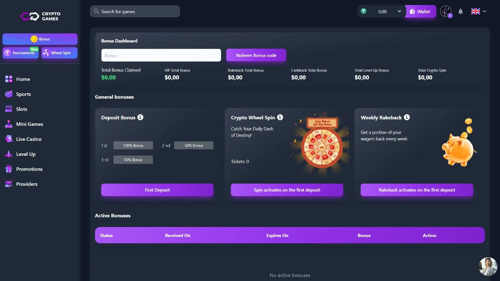Every casino player loves bonuses, especially bonuses with low wagering requirements. Well, at Crypto-Games.io casino, you will find a juicy welcome deposit bonus from which you can get up to 20,000 USDT in bonuses. However, rather than that, there is nothing more that you can use to get more bang for your buck. The few exceptions are the Rakeback, the Cashback, and the VIP program, of course, but we will leave that for later!