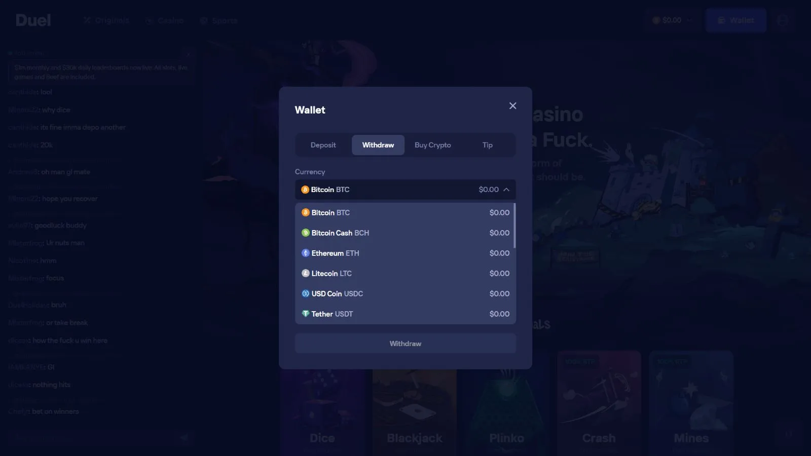 Duel also features a selection of 8 Originals. These are not just games adapted from other developers, but are built by in-house developers of the casino itself. These games are Dice, Blackjack, Plinko, Mines, Keno, Castle Roulette, Beef, and Crash.