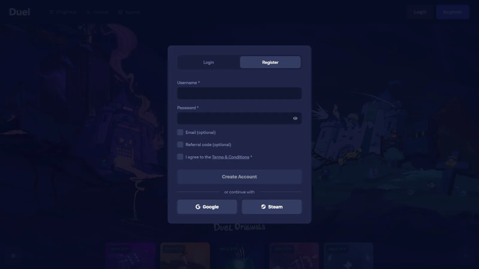 Thanks to its simplified registration process, you can open a Duel Casino account in under a minute. It only requires a username and a password. There’s also the option to register via Google or Stream, though those methods may link personal data to your account.