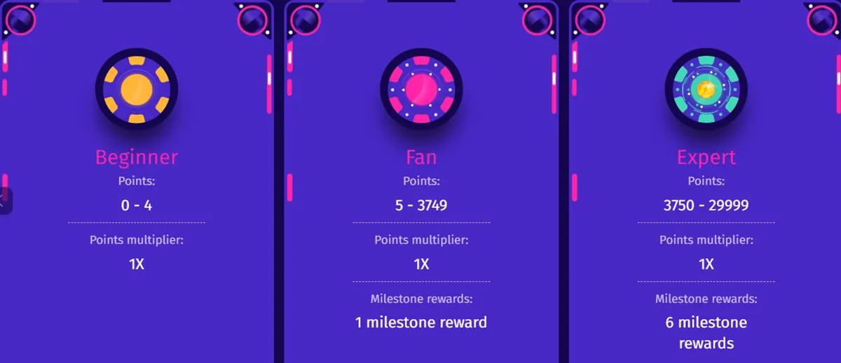 – Expert: 3,750 – 29,999 points requirement, 1x points multiplier, and 6 milestone rewards