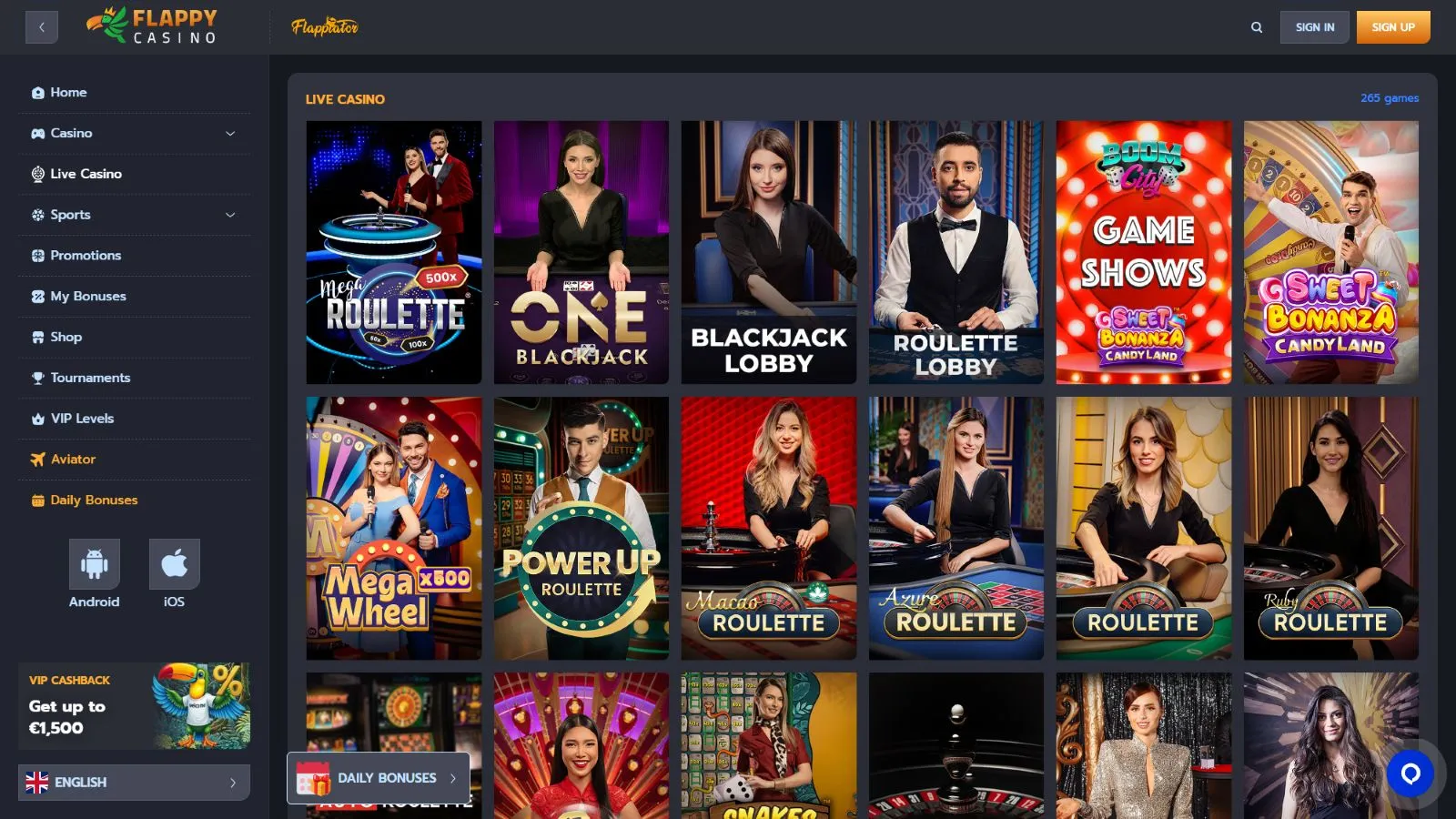 Flappy Casino features 11,000+ games under three sections – slots, table games, and live casino – from 89 providers. Top-tier providers at this online crypto casino are: