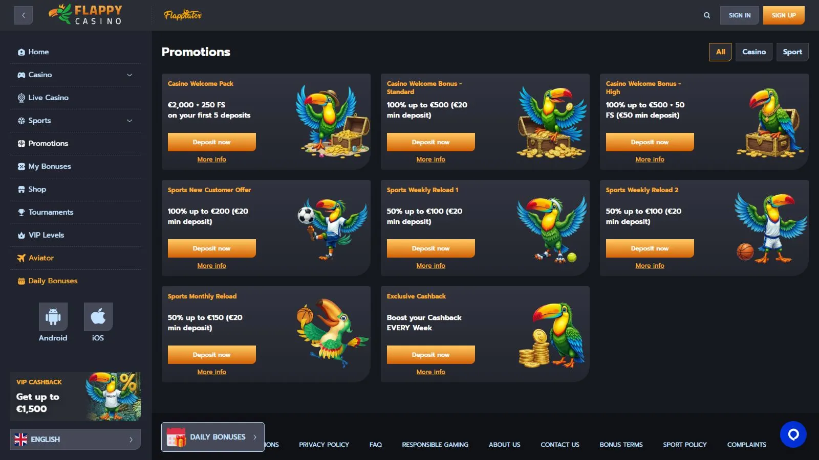 Launched in 2023, Flappy Casino is a crypto site with an extensive casino library and sports betting options. It is available in languages like English, German, Italian, Magyar, and Portuguese.
