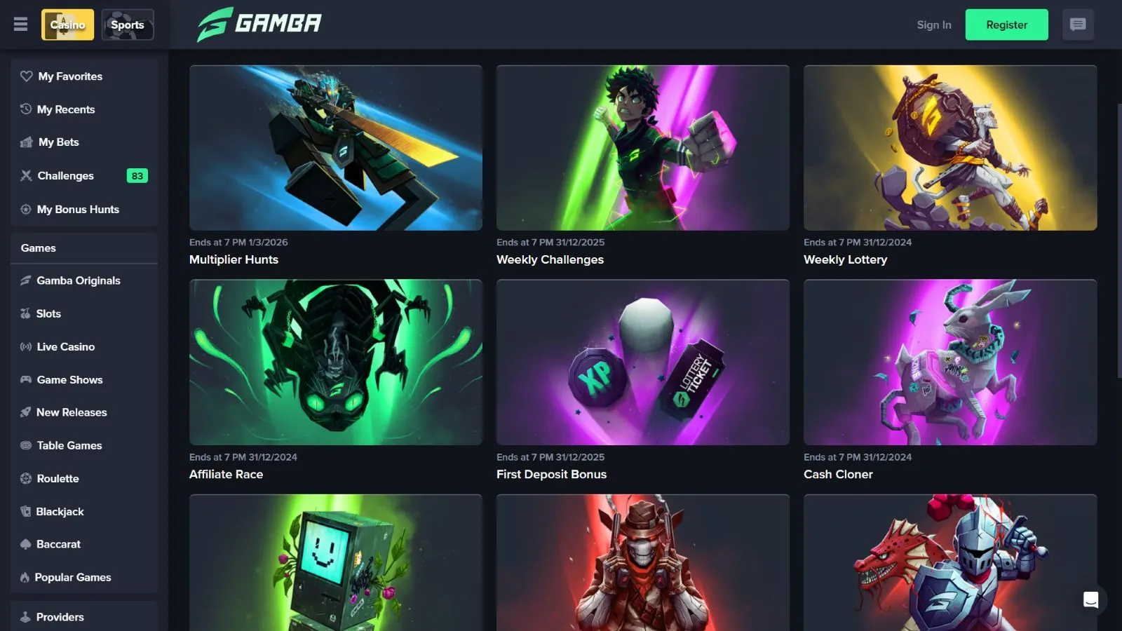 Although there aren’t regular reload bonuses or cashback deals, Gamba offers numerous challenges and tournaments. These include weekly challenges, multiplier hunts, weekly lotteries, and more. There are also many sports promos available.