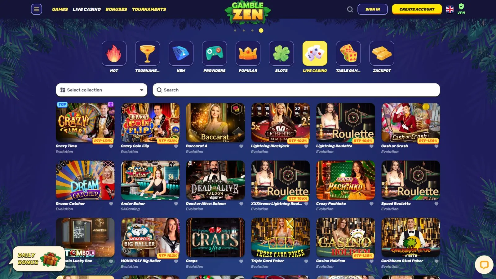 Buzzing with 12,000+ games, Gamblezen is surely where every casino player wants to be. The collection covers every style you can imagine. From classic slots to RNG tables, live rooms, and even niche titles you didn’t know existed.