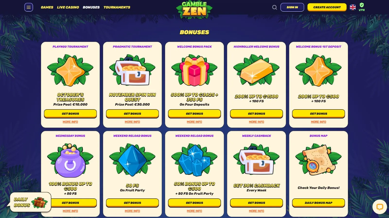 Every Wednesday, you can get something on top of your deposits at Gamblezen. With at least €20, you qualify for 100% up to €500 + 50 free spins. The wagering requirements and validity are the same as the welcome offer.