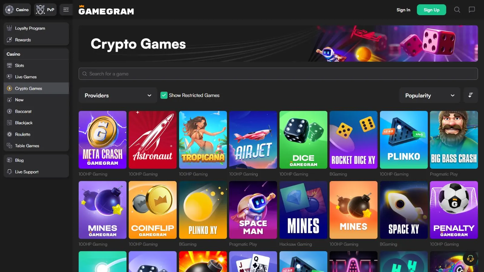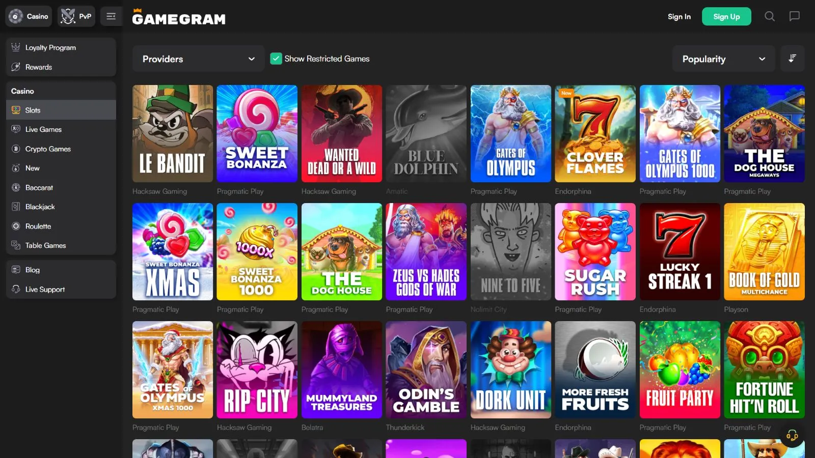 Gamgram also offers other categories like virtual table games, crash, video poker, and instant wins. Its live casino section is rich with 75+ games, including blackjack, poker, baccarat, and roulette. What’s more, the casino has a PVP section, where you get to compete with other players in unique games.