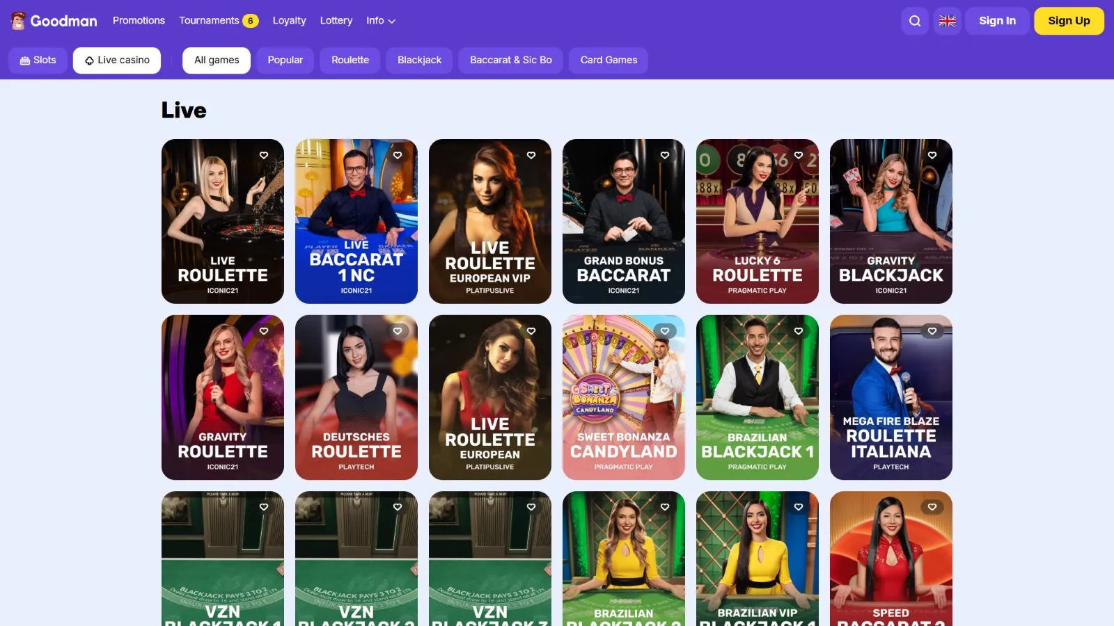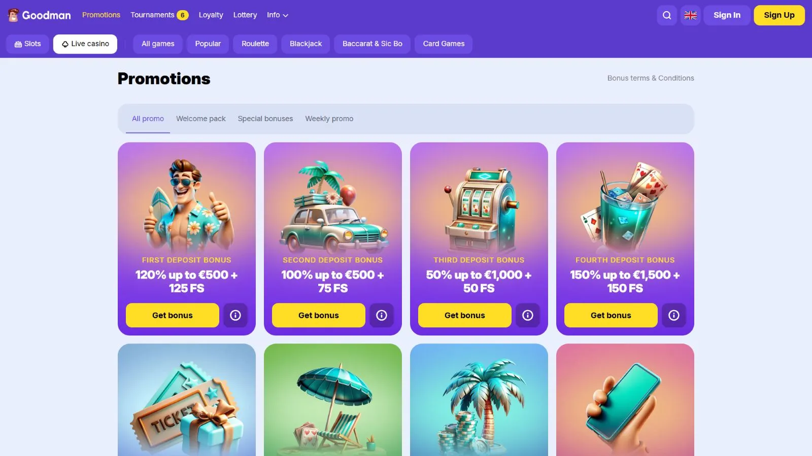 Apart from the above-mentioned promotions, Goodman offers existing players weekly casino bonuses. These online casino promotions are packed with amazing bonus rewards. For example, live casino fanatics get to enjoy the Weekly Cash Drop promotion when playing at the Pragmatic live dealer’s section. The monthly cash prize pool offer for this promotion is €500,000.