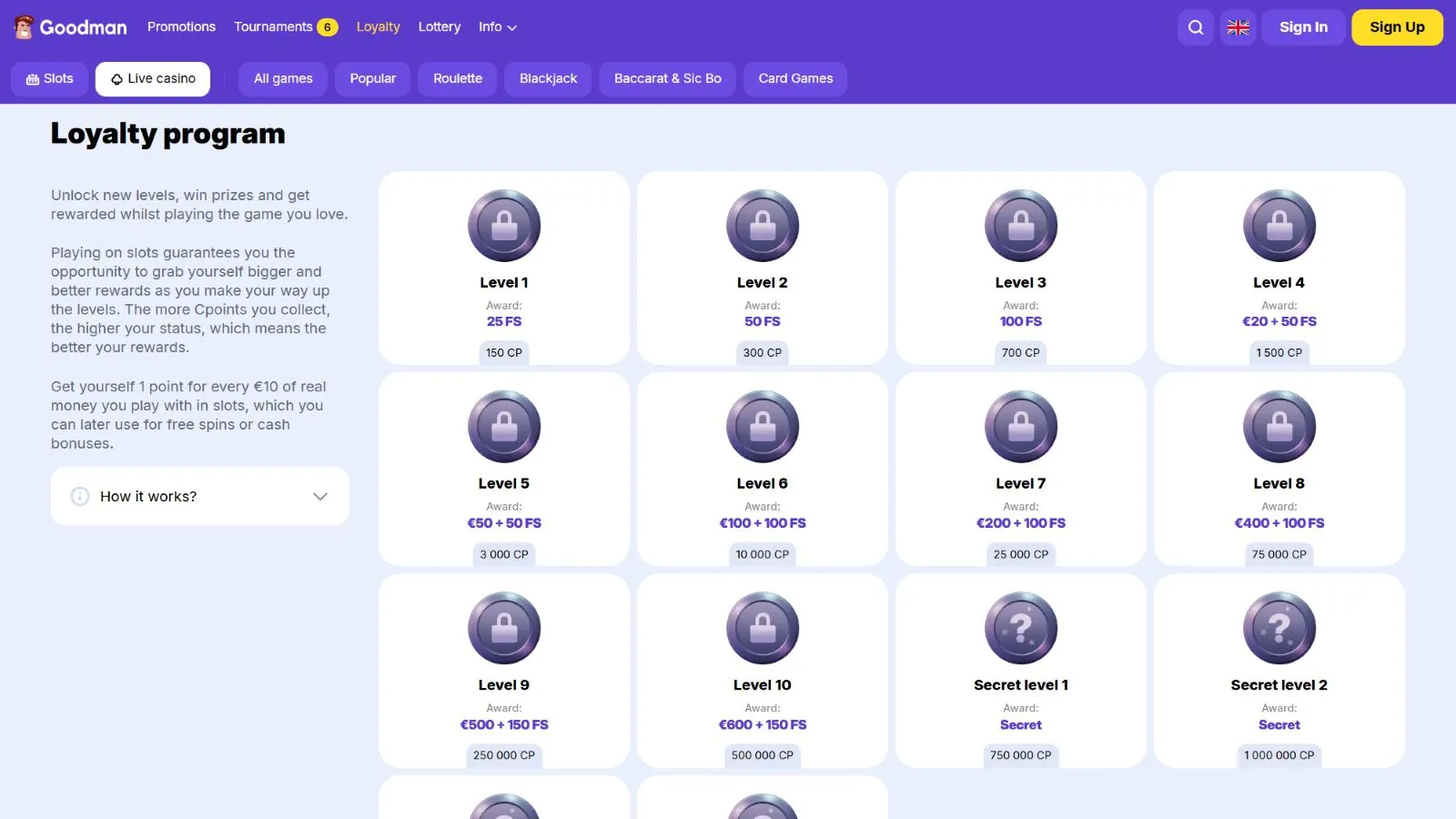Goodman Online Casino has one of the best VIP reward program. There are 14 levels, each with a specific reward. But you should note that you must accumulate a specific number of points to climb the tier levels. So, to get these points, you must wager more on the slots at the online casino. For example, to unlock the first level, you must have 150 points. Some of the rewards available in the Goodman Casino VIP program are free spins, fast withdrawal processing, and exclusive bonus offers.