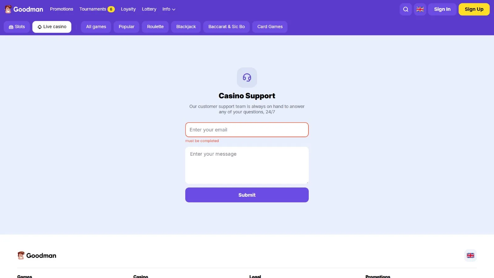 Goodman Casino offers you two customer support options- live chat and email. So, if you encounter any issue while at the online casino, you can send an email request to support@goodmancasino.com or fill in an on-site contact form. The Goodman Casino support will then send a response within a short period of time. But if you want a more immediate r response, you can use the live chat option. The feature is available 24/7 on the main casino website. Goodman Online Casino also has an FAQ section with all the common questions on how the site operates answered.