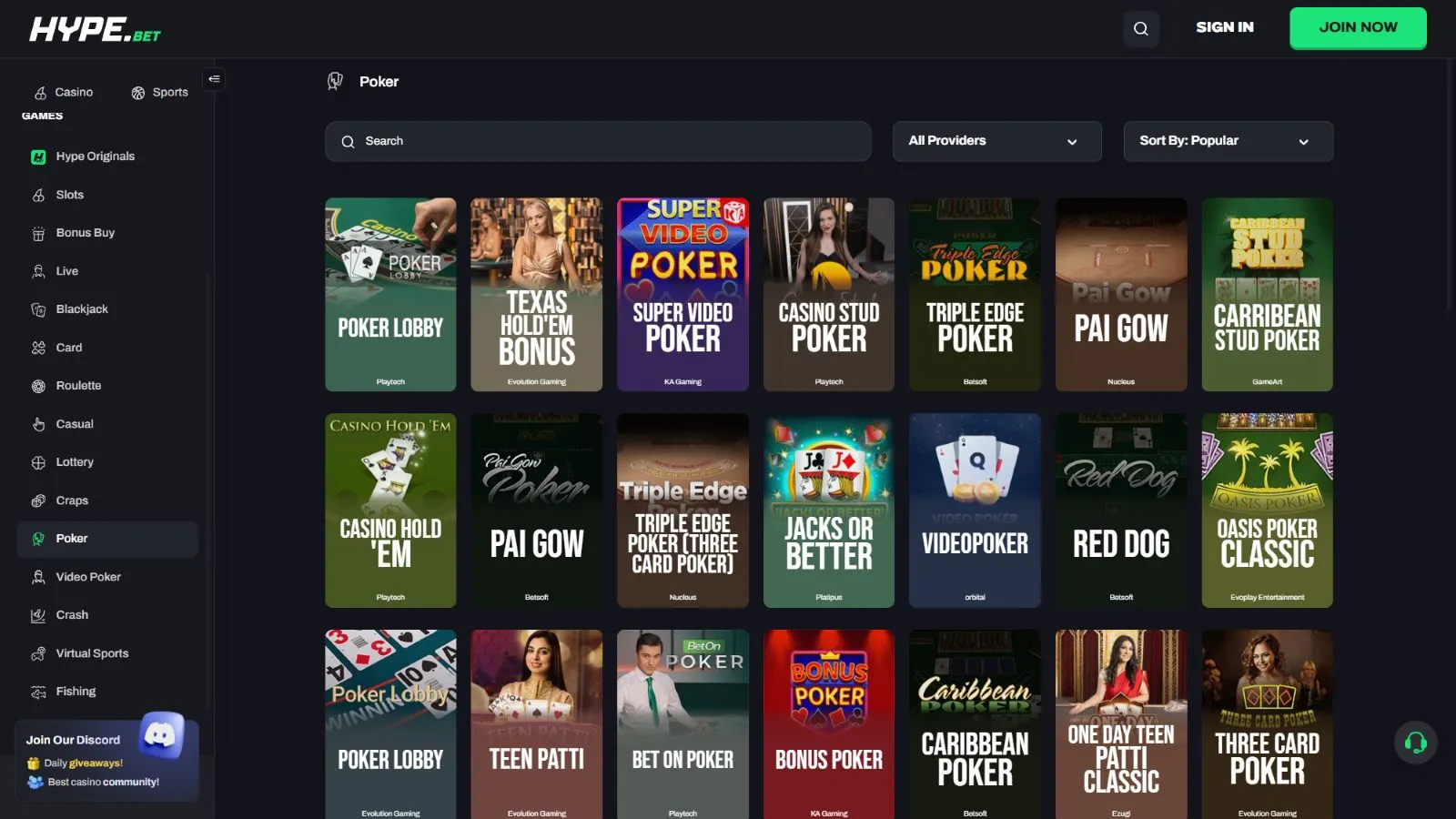 The Hype.Bet live casino section houses over 1,000 games from renowned providers. It contains popular games like live roulette, live baccarat, and live blackjack, among others. Other available games in the casino include hype originals, video poker, crash, virtual sports, fishing, craps, and lottery.