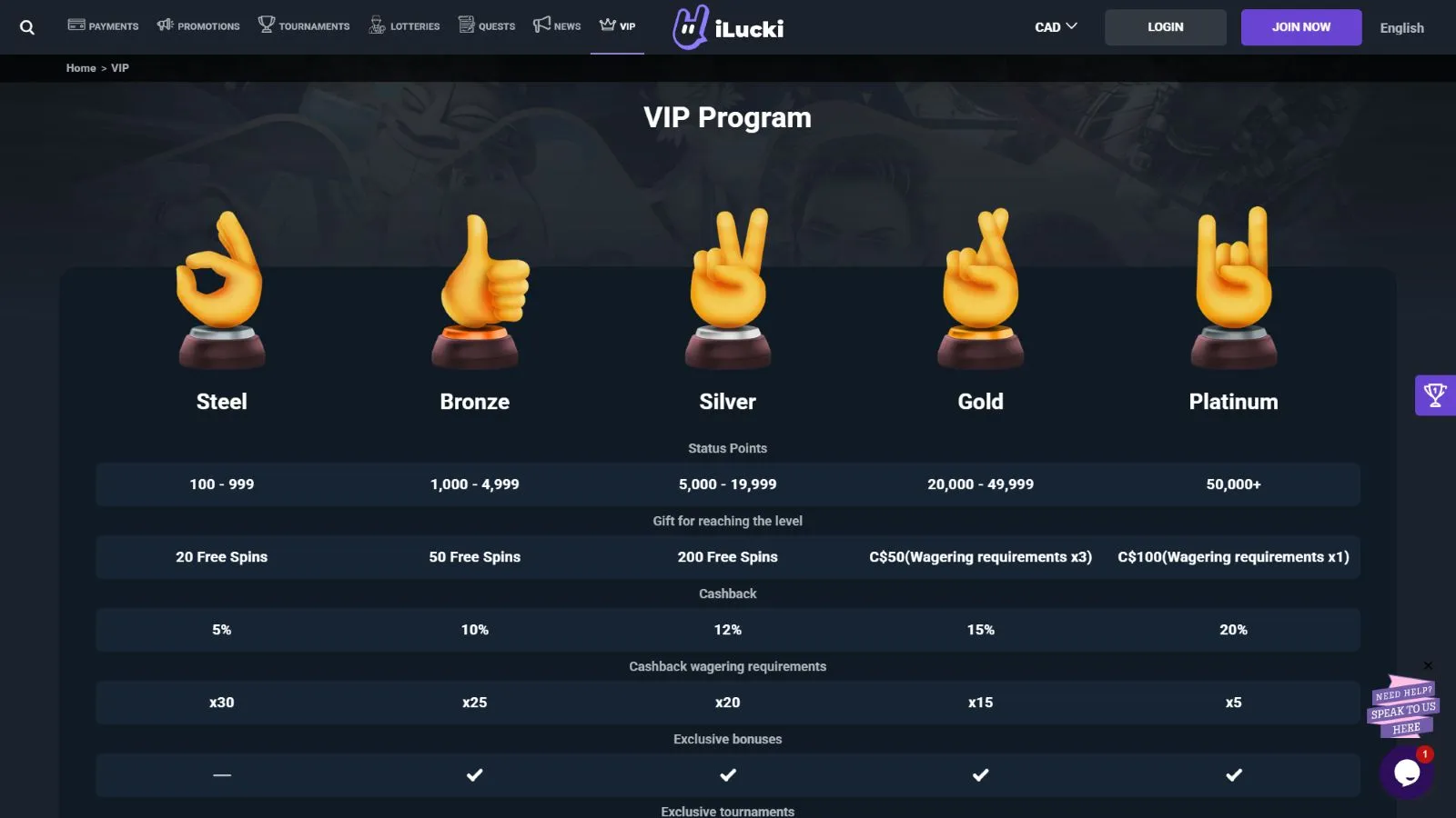 The iLucki loyalty program includes five reputation levels. It has a fairly low entry barrier, granting the first VIP level as soon as the total amount of your deposits becomes $50 or more. It alone grants access to such bonuses as 20 free spins and 5% cashback. The following levels bring about increased bonuses and exclusive awards like cash prizes with no wagering requirements.