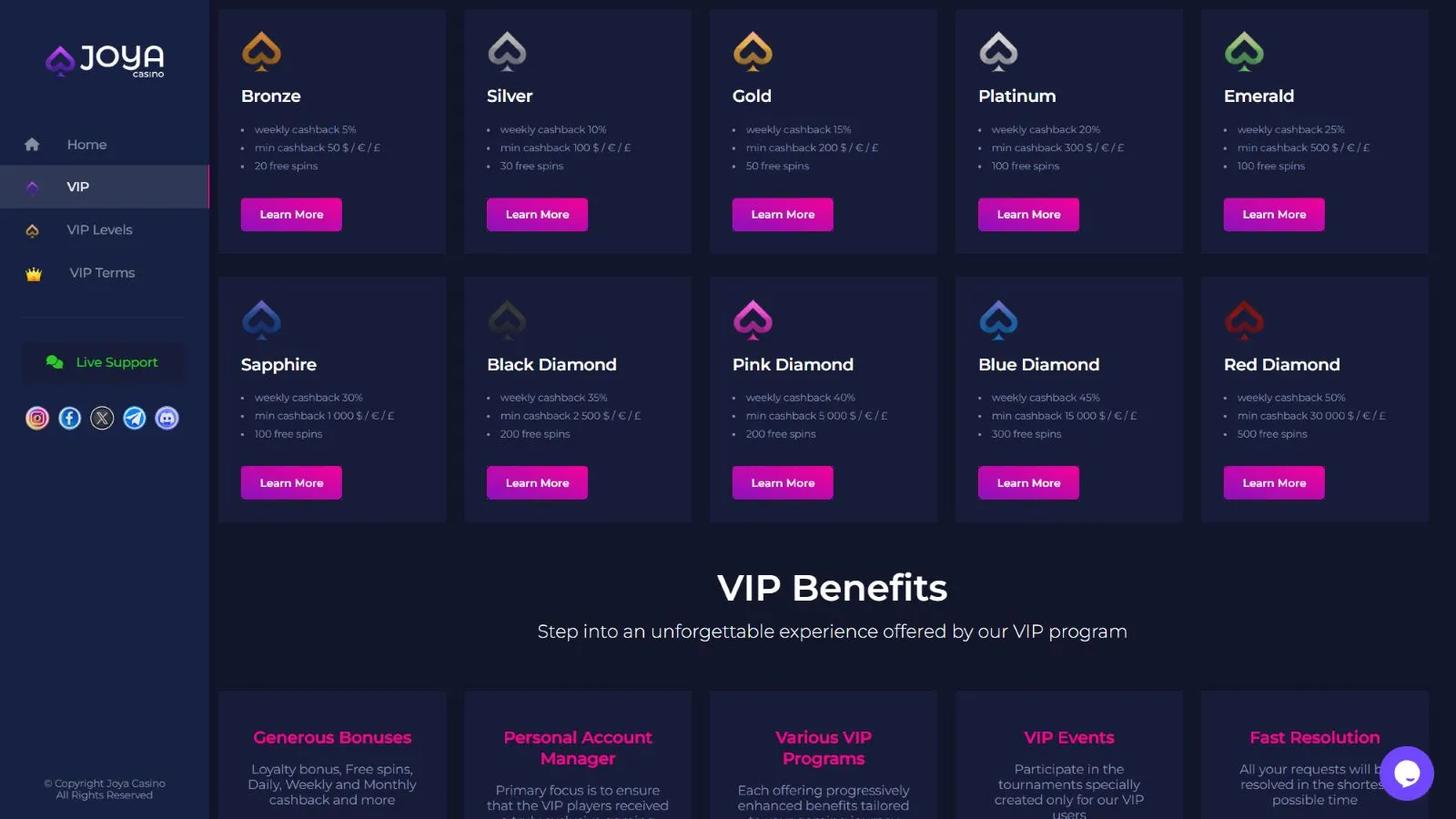 The Joya loyalty program ensures you enjoy even more promos and perks. Although it has just four levels, it offers beautiful bonuses, which makes it one of the best VIP programs around.