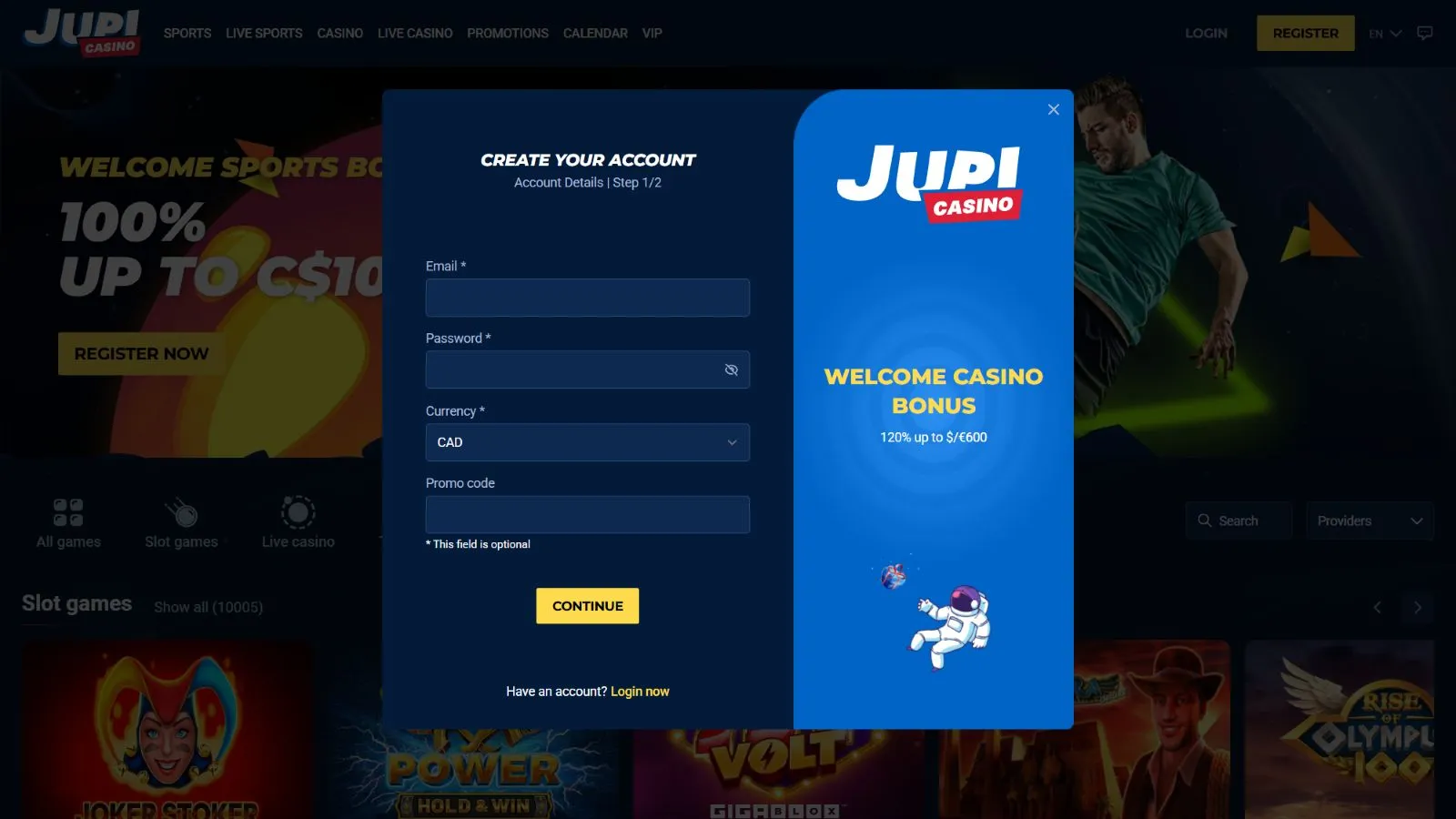 To start the registration procedure at Jupi casino, click on the yellow “Register” button in the top right corner of the casino page. Then, enter your email address, password, and preferred currency, and click on “Continue”. On the next page, fill out the form with your details, and once you are done with that, check your email account for the verification email that was sent to you. Confirm your email address by clicking on the button “Confirm your Email” in the body of the email message.