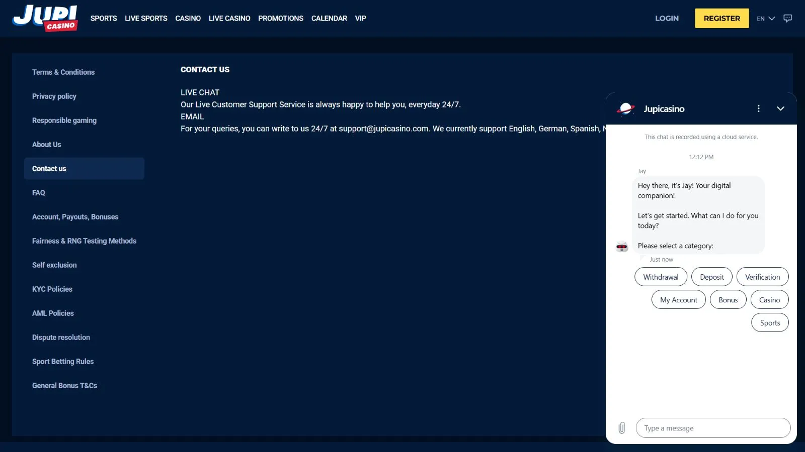 - Email message – This is the most simple one, but it is also the slowest method. You should send the email message to the following email address support@jupicasino.com