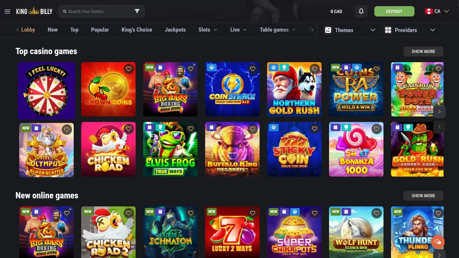 Below that bar, there is a huge featured image of the generous welcome bonus package of King Billy casino. Underneath, you can see the categories of online games, the search field, and the provider’s filter.