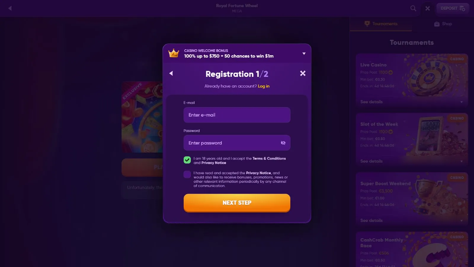 To kickstart your adventure, the casino welcomes you with 100% up to €500 + 50 Chances to win €1m. The offer is simple – €500 bonus to play various casino games and 50 free spins on the Royal Fortune Wheel, where you can win up to €1,000,000 in cash prizes. If you do not get the bonus after depositing, reach out to the support team before playing games.