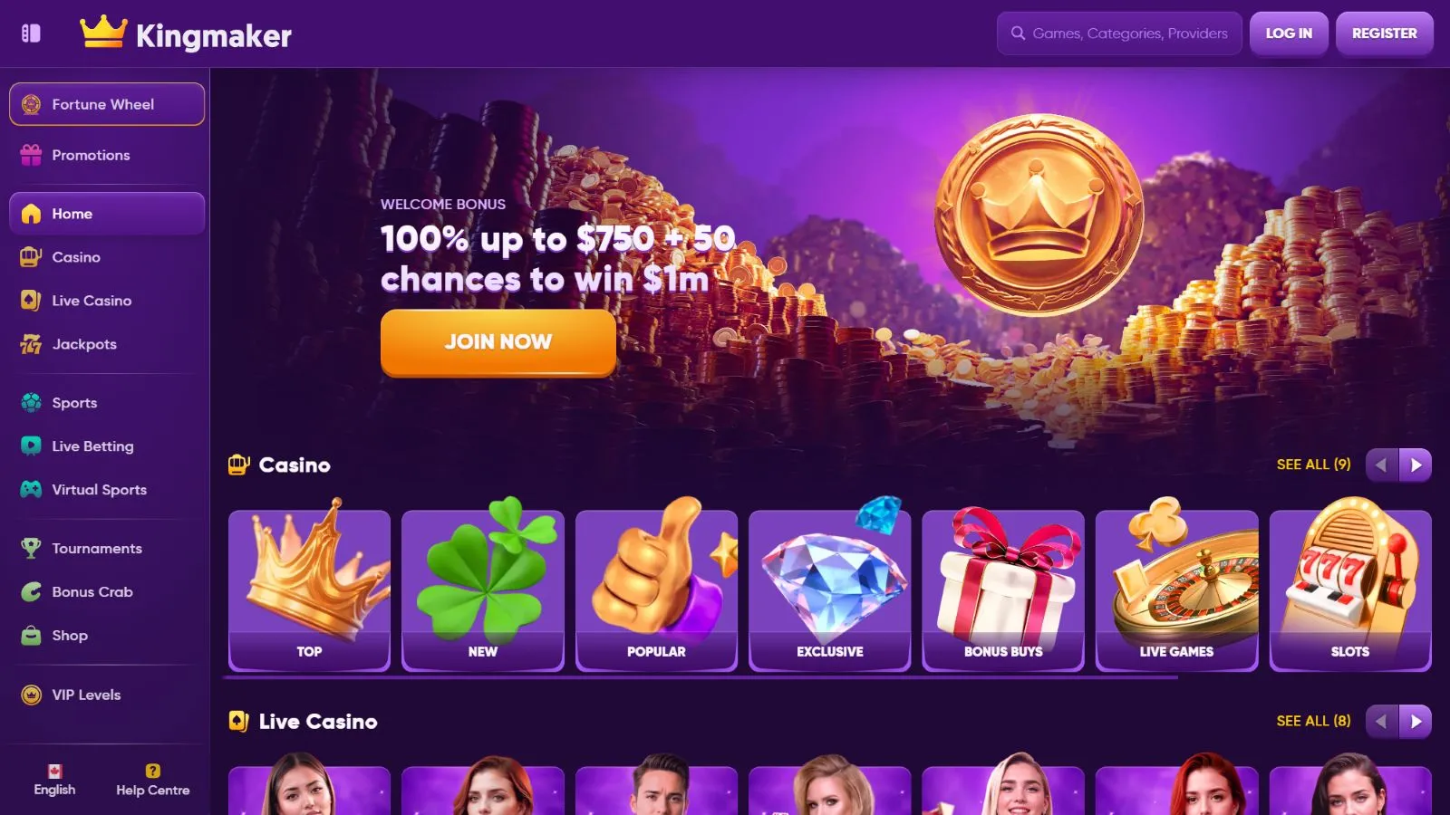 Established in 2024, Kingmaker Casino is an impressive online gambling site with a massive selection of games, excellent sports betting markets, and amazing bonuses. The crypto casino accepts players from over 100 countries and supports gambling in 15+ languages.