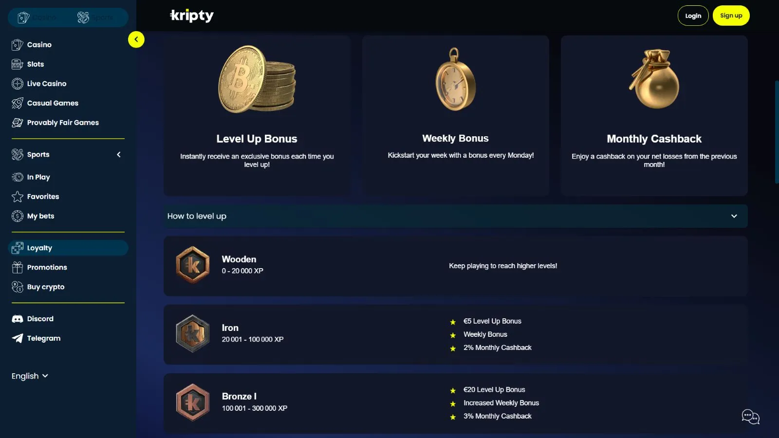 Users at Kripty Online Casino will enjoy an excellent loyalty system that brings them many bonuses and other perks. Depending on your level, you receive level-up bonuses, weekly reload deals, and monthly cashback. The maximum monthly cashback you can receive, regardless of your level, is €10,000.