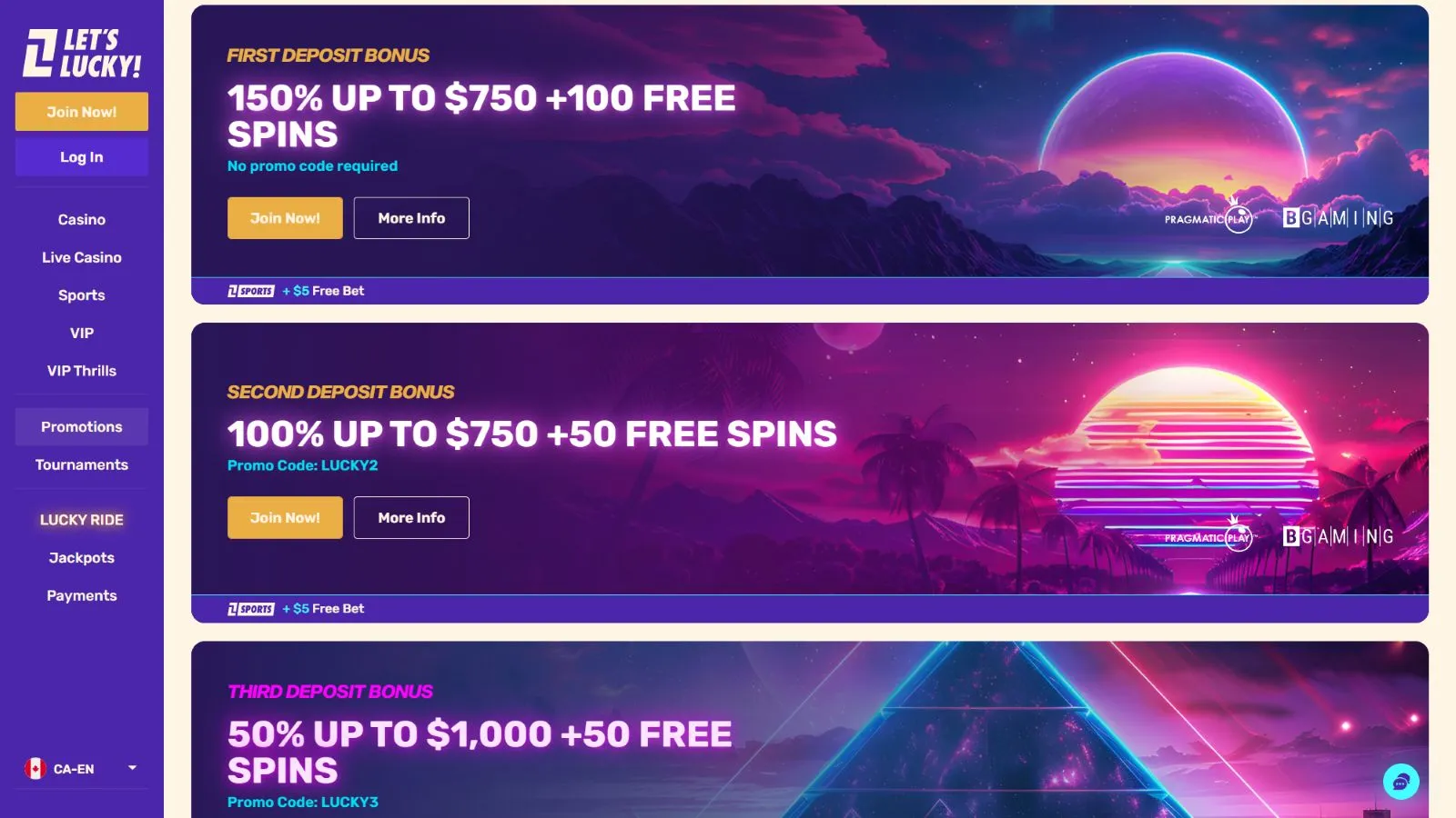 Ride off into the sunset with Lets Lucky Casino free spins, cash bonuses, and more with Lucky Ride. Just use the bonus code RIDE before depositing at least 30 USD. Then, choose one of the rides and get the mystery bonus.
