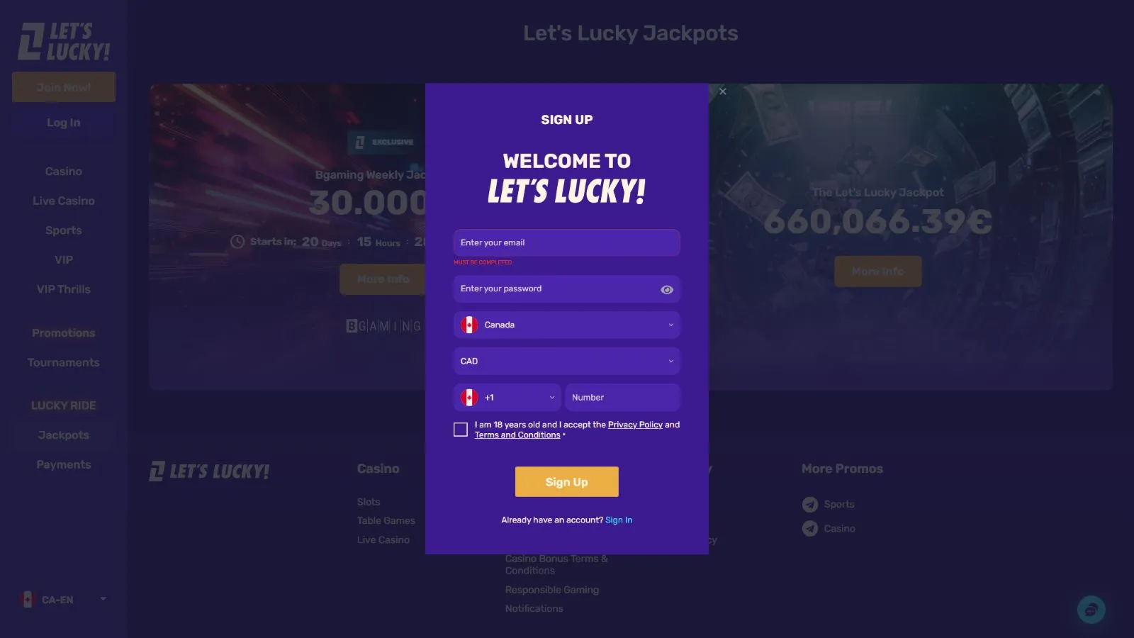 Start by clicking Join Now on the left-hand side of the screen. Then, fill in the text boxes with the required information and tick the checkbox to confirm that you’re over 18. Then, click Sign Up. You’ll see a welcome message congratulating you on creating your LetsLucky Casino account.