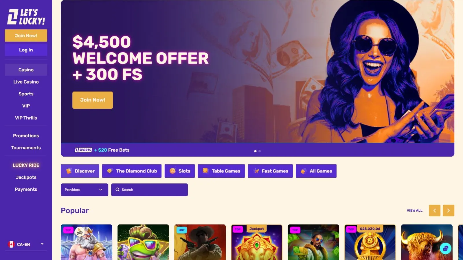 If you’re the type of player who prefers a little bit of everything, you’ll be happy with the vast game selection that you can find on Let’s Lucky Casino. They’ve covered all the main stuff, like Slots, Table Games, Fast Games, and Live Casino Games.