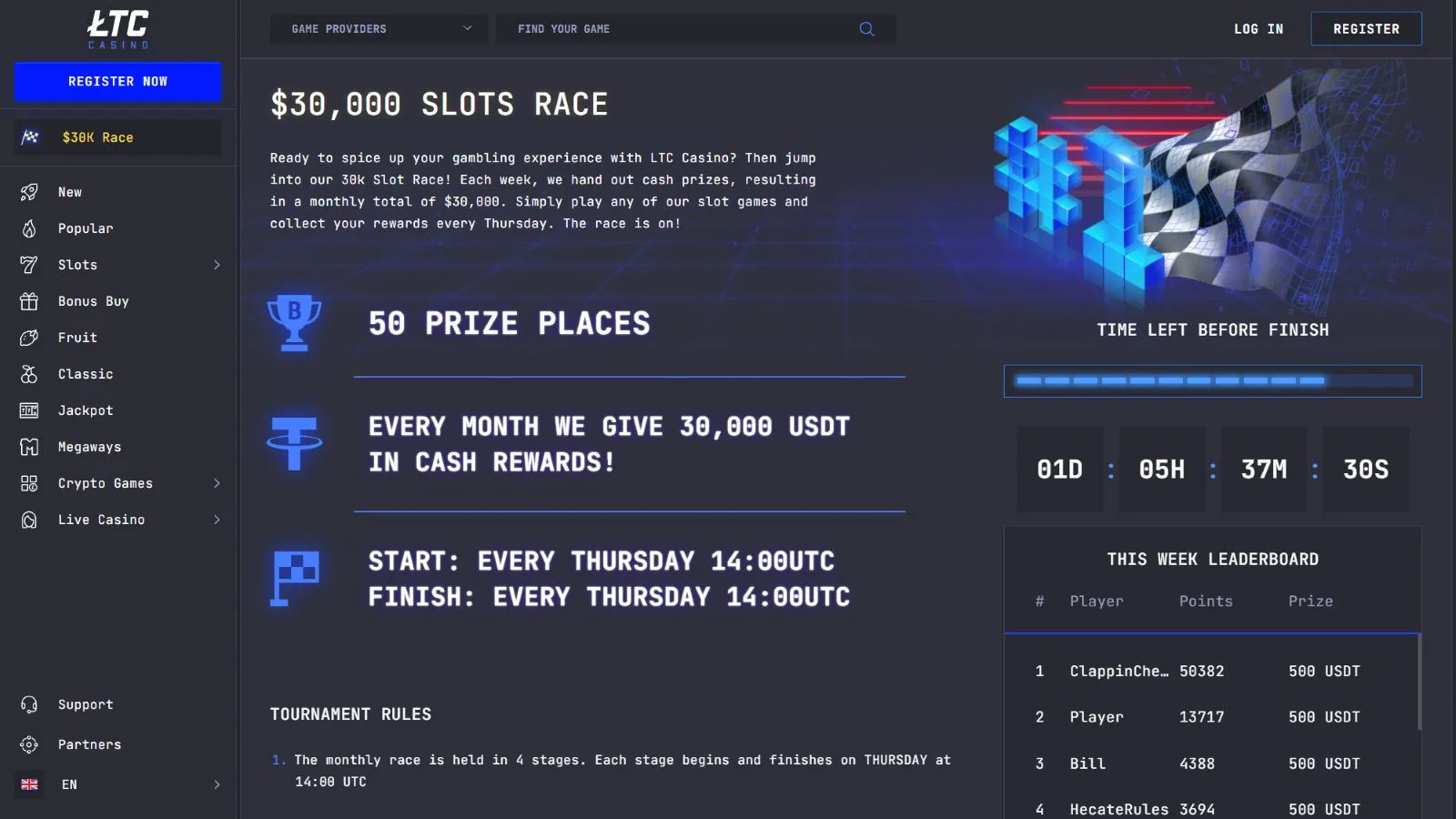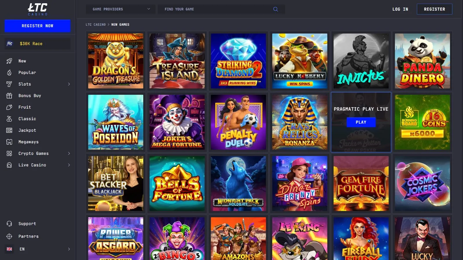 We really like their slots selection because there is a huge number of popular online slots that you can find at LTC casino. To find their slots, just click on the Slots tab from the left menu. Now you can see their most played games. If you want, you can also filter them by the game provider. To do this, all you have to do is to click on any of the game providers available, and their system will automatically filter the slots from that studio.