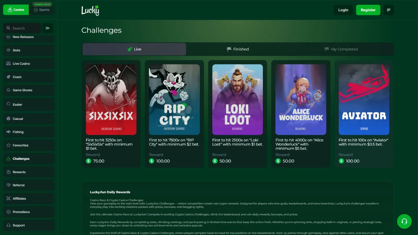 Lucky.fun spices things up with challenges that run alongside your gameplay. Typically, the first player to hit a set win multiplier on a chosen slot with the required minimum bet walks away with the reward. The prizes are usually $50 or $100 in real cash.