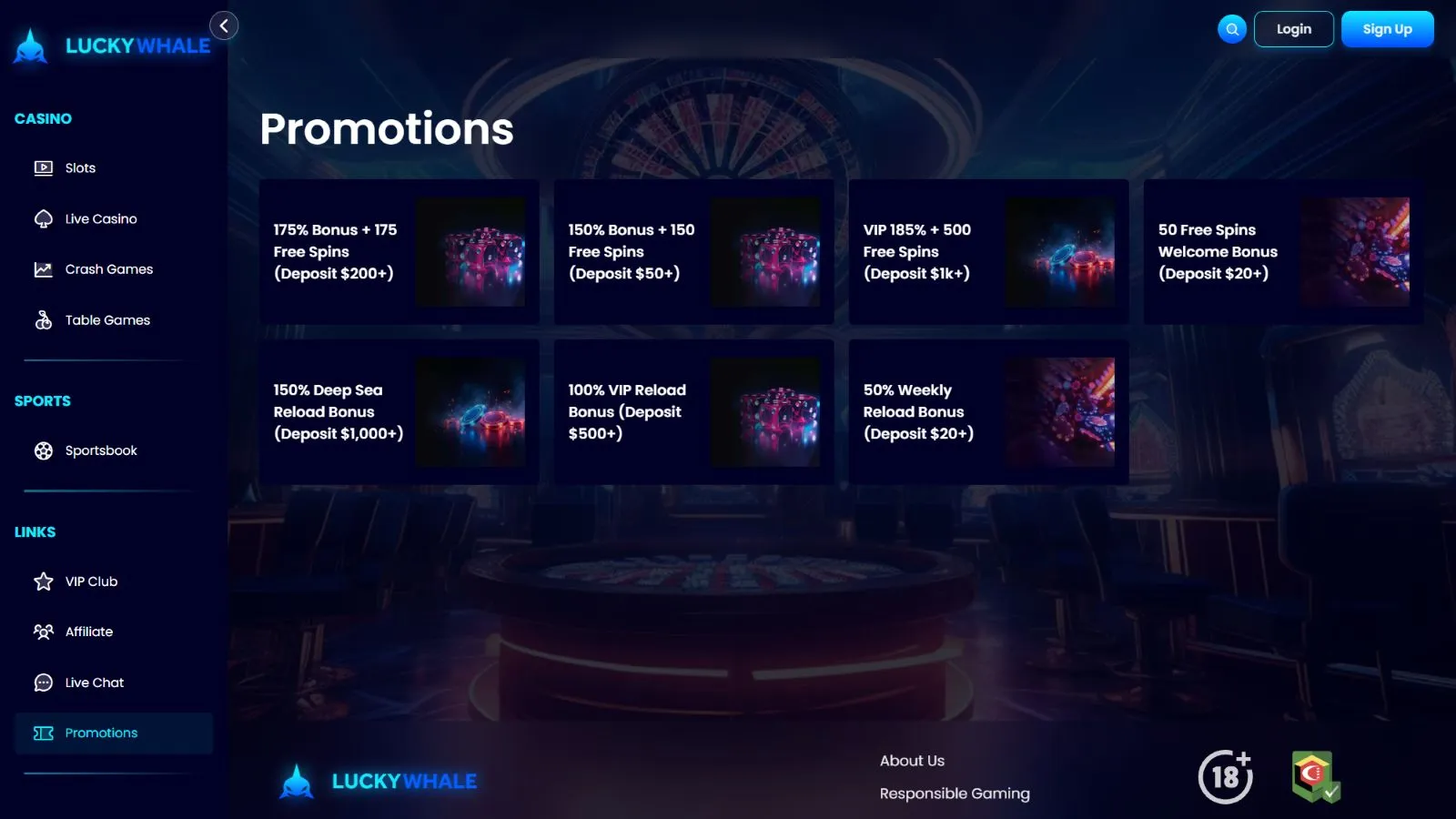 Lucky Whale offers a wide range of bonuses and promos for both new and existing players. There are numerous welcome bonus offers and many reload deals for players to claim.