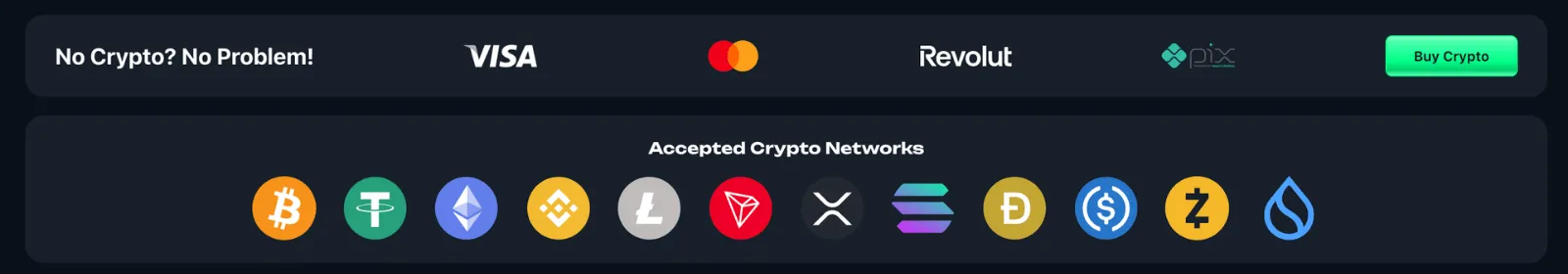 All you need is at least $10 in your crypto wallet, then you can deposit on this platform. It supports USDT, BTC, ETH, SOL, USDC, XRP, BNB, TRX, LTC, DOGE, ZEC, and SUI. There’s no maximum cap on deposits.