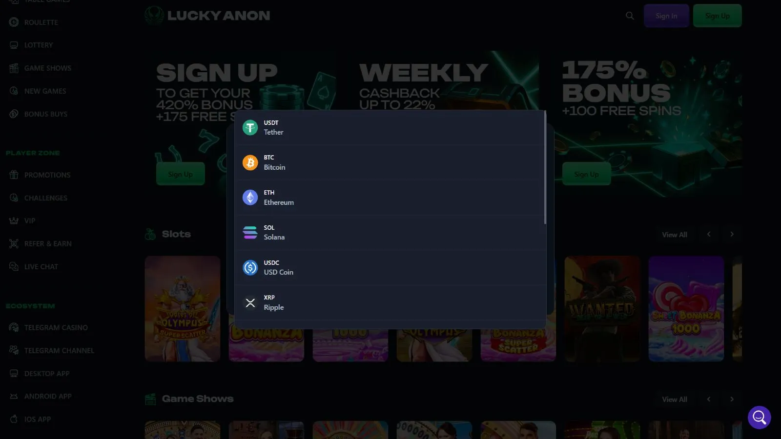 Like every other anonymous casino, LuckyAnon relies on crypto payments. There’s no chance of making quick payments with your cards or doing a bank transfer.