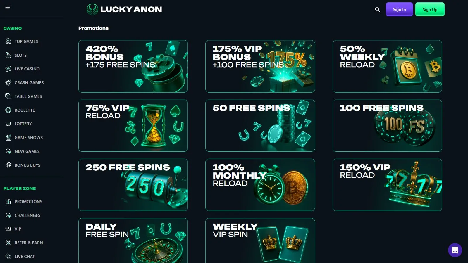 LuckyAnon keeps the excitement going with reload bonuses for players to claim weekly and monthly. The size of your bonus depends on how much you deposit and your VIP status. Regardless of which offer you claim, a 35x deposit + bonus rollover applies.